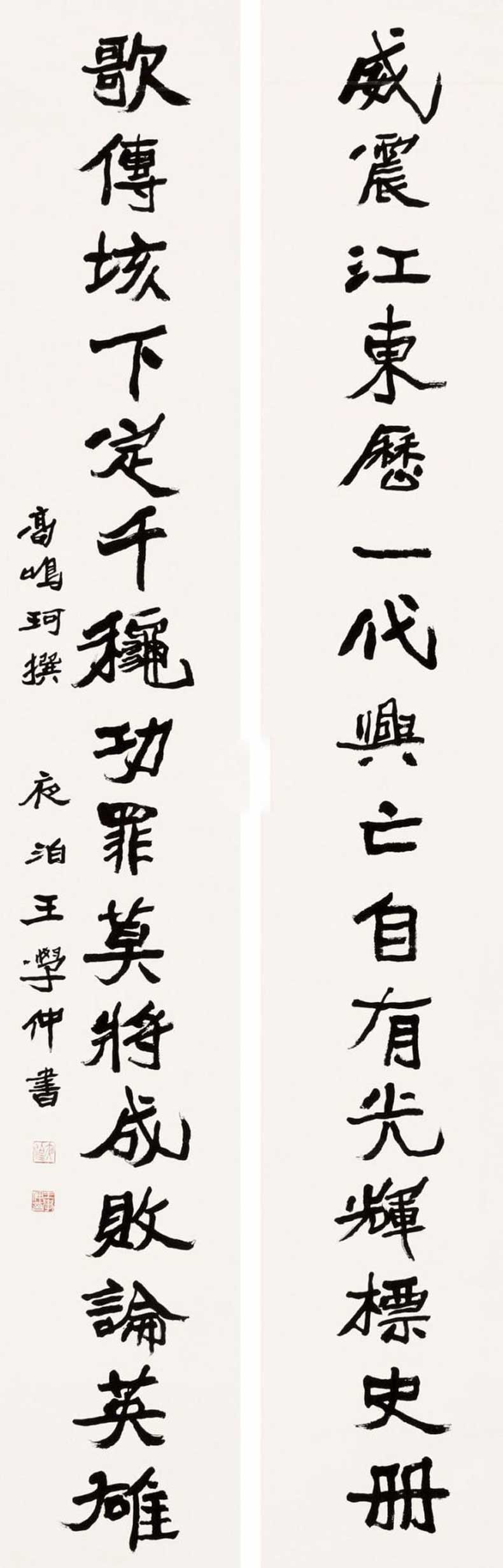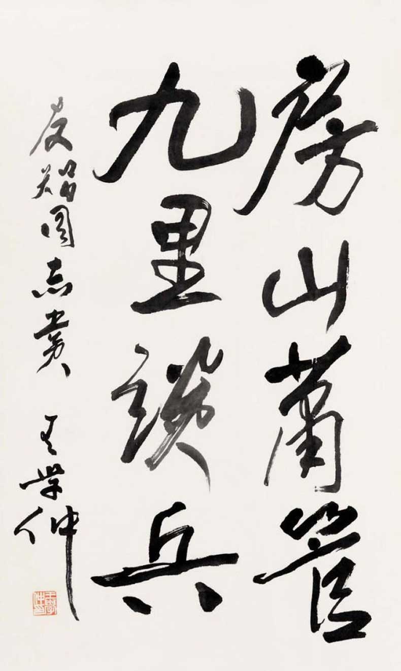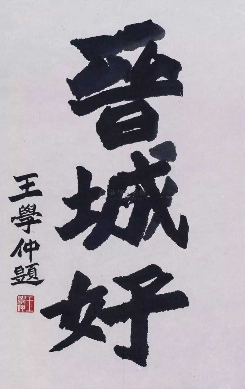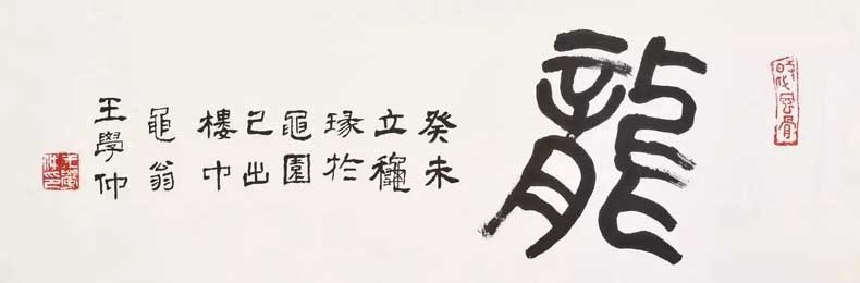 王学仲在书法创作上的成就,主要体现在魏碑、隶书及碑体行草的创作上,尤其是魏碑和碑体行草创作可谓开当代魏碑新风法门者。清人赵之谦、近人康有为、现代于右任都是碑体行草探索和力行者,其成就斐然,王学仲以画家的审美和鲁人的质朴,将碑体行草写出另一番景象,其书法语言及符号的意义,在当今书坛的地位是无可取代的,并可作为一个时代的标志性载人书史。