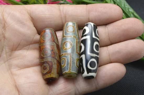 九眼天珠是沉积岩材质的才是真的天珠,因表面有像眼睛的花纹而得名,材质主要为玉或玛瑙的沉积岩。天珠材质很多,还有海螺化石材质的海天天珠,底色纯黑有白线花纹的一线天珠,内部有丝状杂质的缠丝天珠。颜色分明、纹路清晰,形状细长的天珠更有价值。