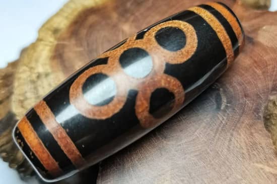 可以从光泽上去鉴别天珠的真假,真的天珠表面的反光率较大,光泽很强,呈油脂光泽。假的天珠的反光率就很差,看上去不够光滑,也没有什么光泽,一看就是人造的。