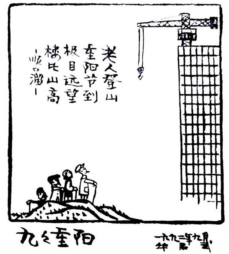 《九九重阳》——老人登山,重阳节到。极目远望,楼比山高。