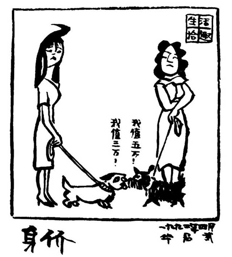 《身价》画面中两位妇女在进行攀比,其中一个说:“我值三万!”另一位不服气的回答:“我值五万!”其实都是在说各自的狗的身价。