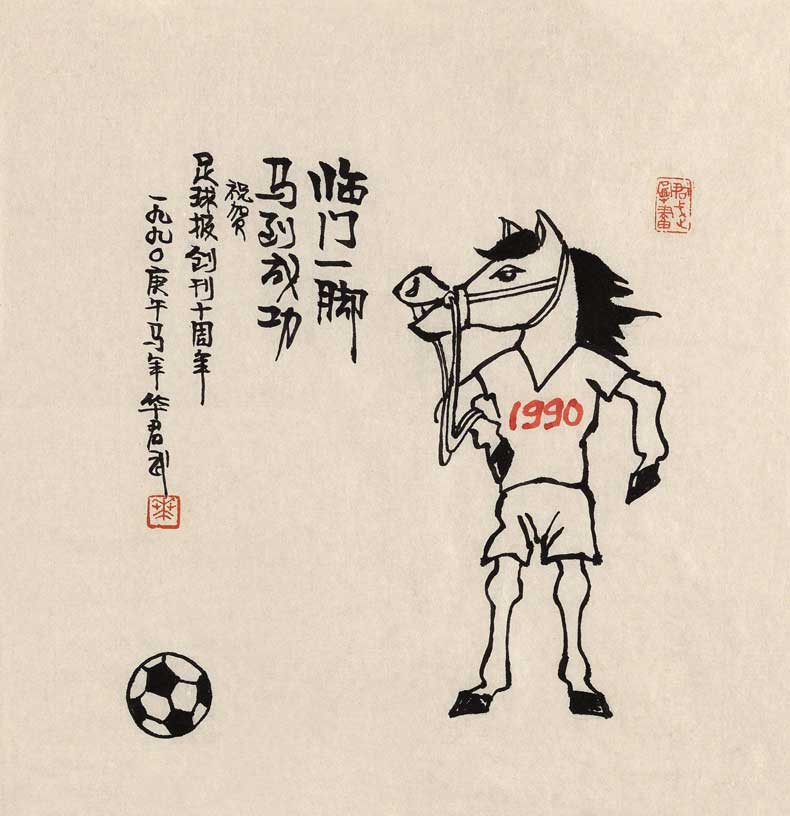临门一脚,马到成功。祝贺《足球报》创刊十周年。一九九○庚午马年,华君武。