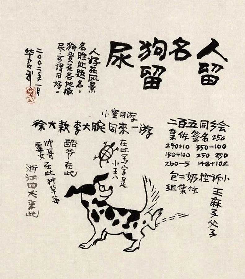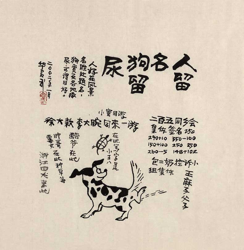 人留名狗留尿。人好在风景名胜处题名,狗爱在各地撒尿,可谓同好。二○○二年一月,华君武。