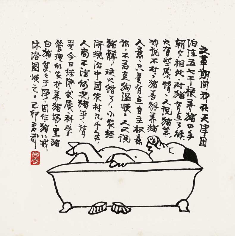 ***期间,我在天津团泊洼住五七干校,养猪四年,朝夕相处,对猪有点了解,也有些感情,人说猪笨,我说不对,猪善解养猪人意,只是有点自主权意识,不若走狗温顺。人又说猪脏,这也错了。小农经济统治中国农村几千年。人尚不洁何况猪乎?请看今日经济发展科学管理的农村养猪场,黑猪白猪只只干净,因作猪八戒沐浴图颂之。己卯,君武。