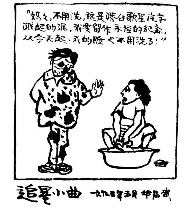 《追星小曲》——“妈妈,不用洗,这是港台歌星汽车溅起的妮,我要留作永恒的纪念。从今天起,我的脸也不用洗了!”看到这幅漫画,我们不禁又想起了赵丽蓉老师的经典小品。