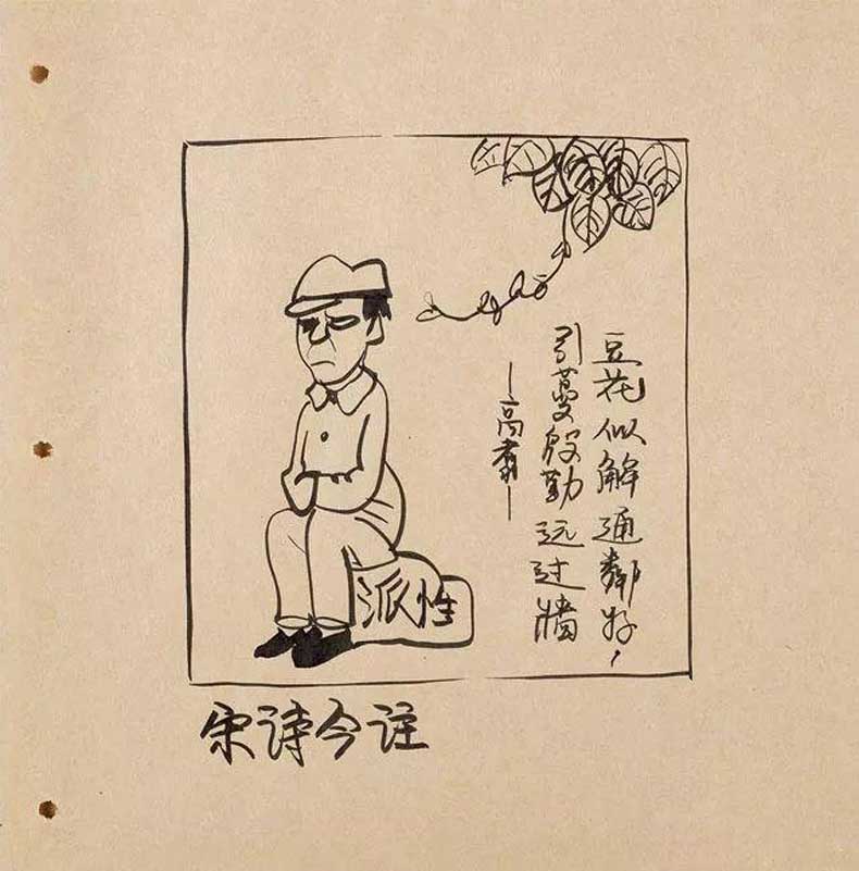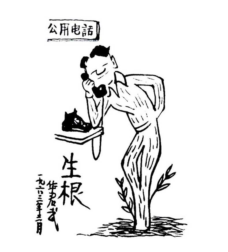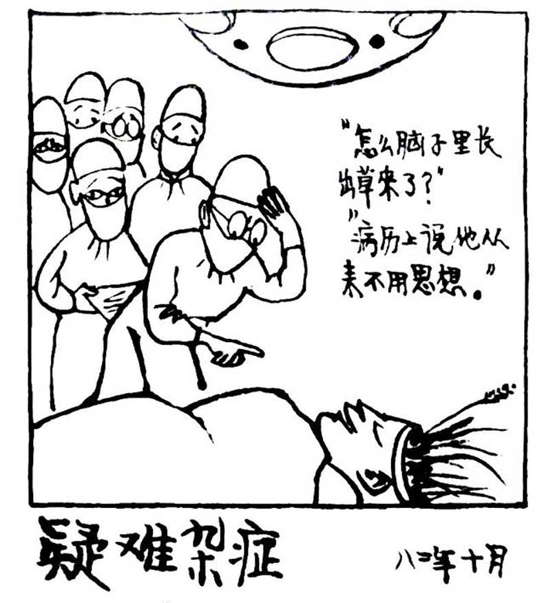 《疑难杂症》——“怎么脑子里长出草来了?”“病历上说他从来不用思想。”先生对于当时社会中的政府公务员不作为的现象绘制了一系列的《疑难杂症》,这幅作品是其中之一。