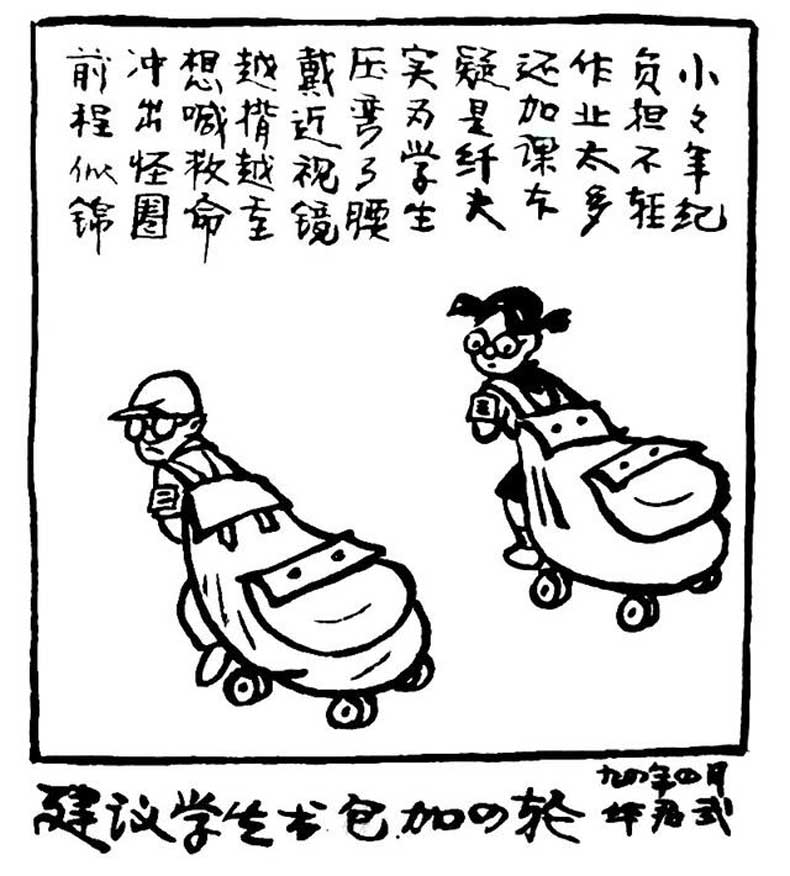 《建议学生书包加的轮》——小小年纪,负担不轻,作业太多,还加课时,疑是纤夫,实为学生,压弯了腰,戴近视镜,越背越重,想喊救命,冲出怪圈,前程似锦。