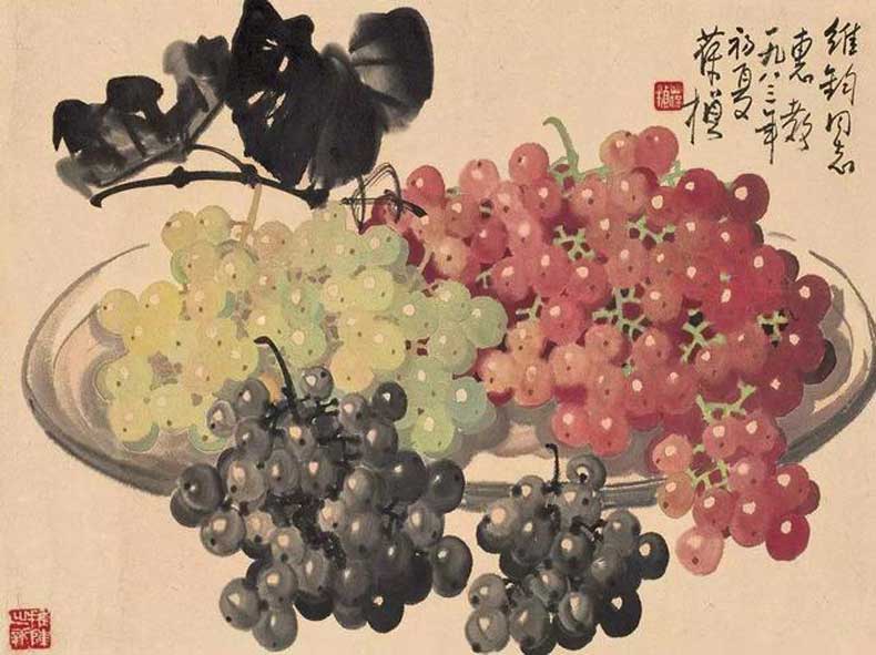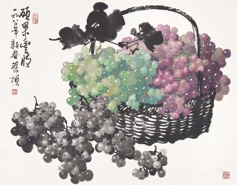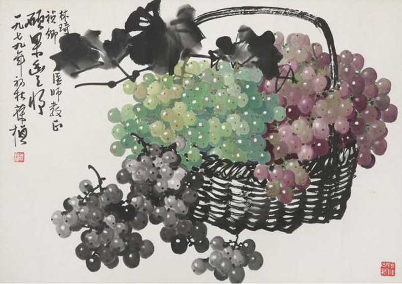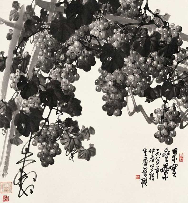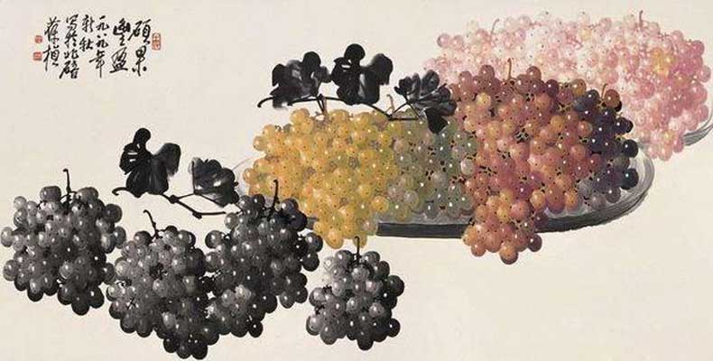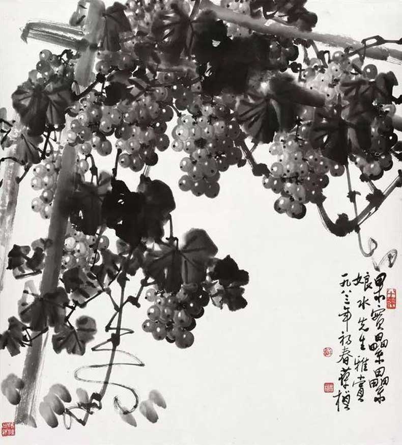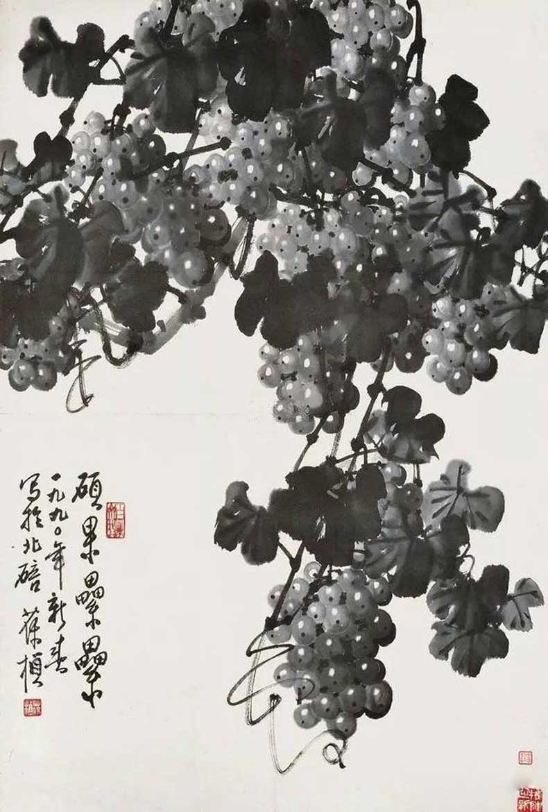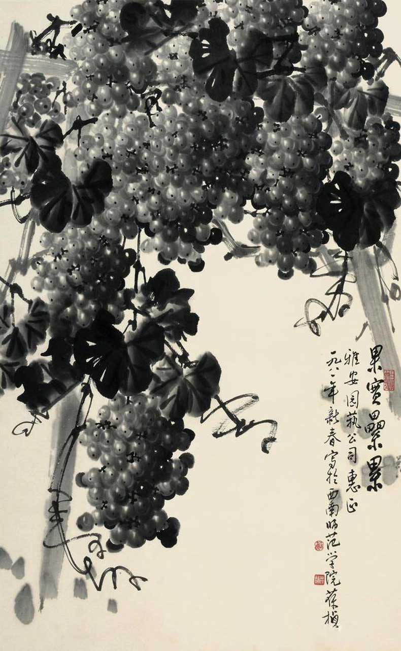 他的葡萄画用焦墨枯笔草书入画,大写出藤蔓、枝干,颗颗葡萄融合了西画色彩的特长,既充分利用生宣的浸润性能和水、墨推拒的天然效果,又运用色彩的浓淡变化,并在葡萄中间留出高光点,这一独特创新的表现手法使他笔下的葡萄水分饱满、丰盛充盈、墨彩交辉、生动自然,充分表现出葡萄那种半透明的质感、光感和空间感,取得了寄神于形、笔力苍劲、墨彩交辉、气韵生动、意境清新、雅俗共赏的艺术效果,深为广大群众所喜爱。