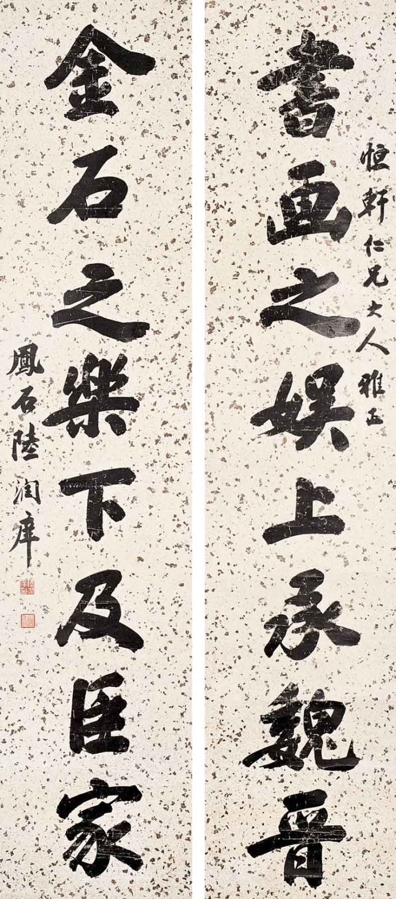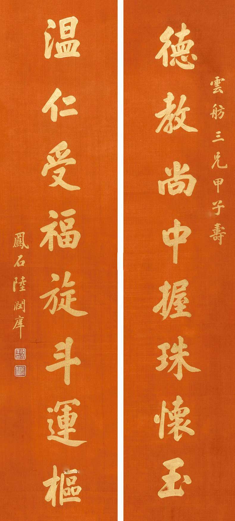 陆润庠(1841~1915),字云洒,又字凤石,别号固叟,江苏苏州人。工书法,意近欧、虞。同治十三年(1874)状元,歴任国子监祭酒、内阁学士、吏部尚书、东阁大学士等职。辛亥***后为溥仪师傅。