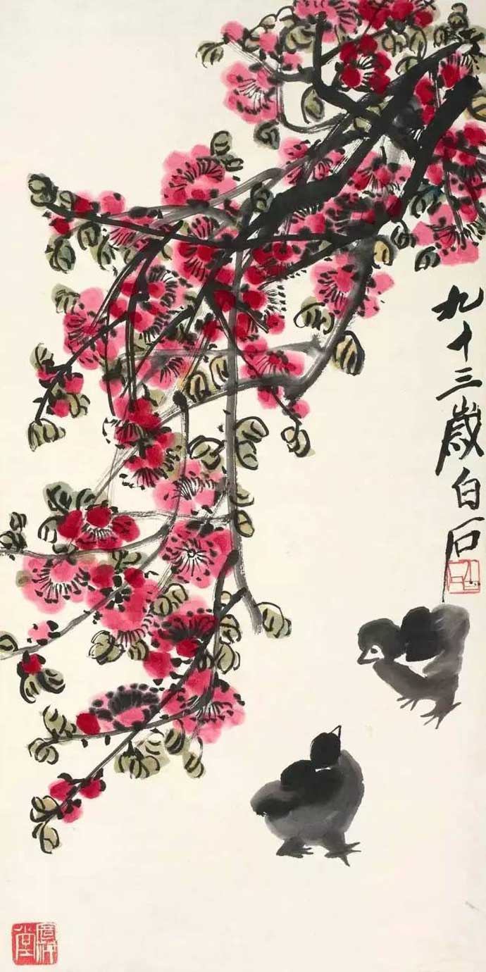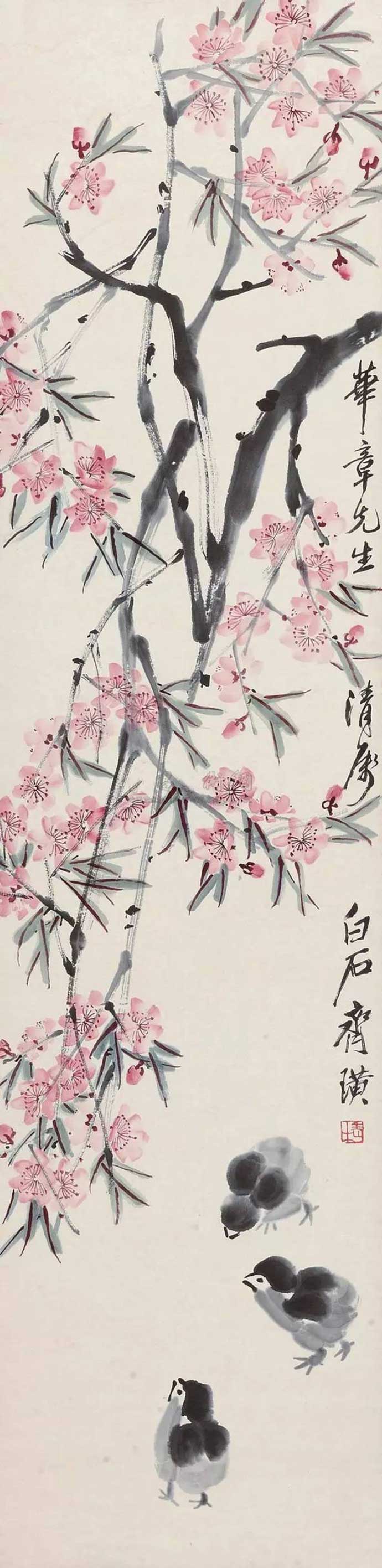 △齐白石《桃花小鸡》