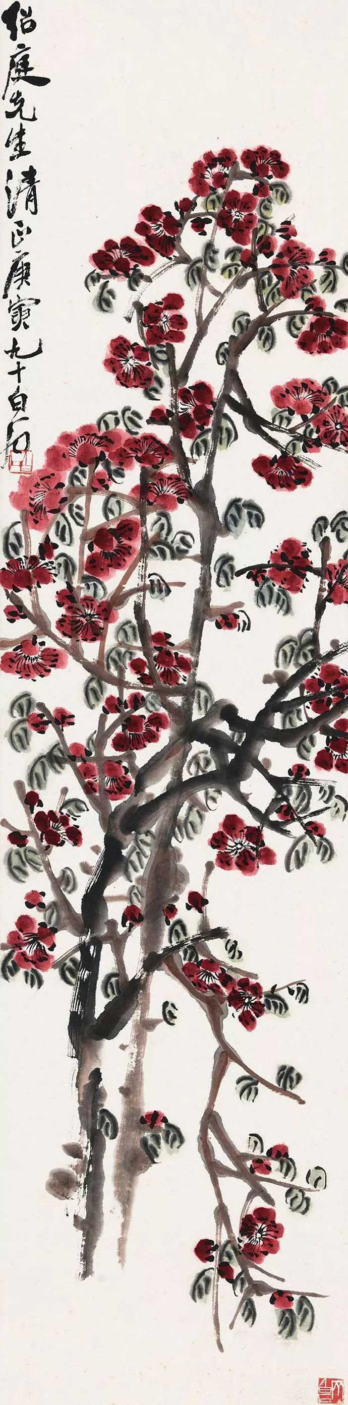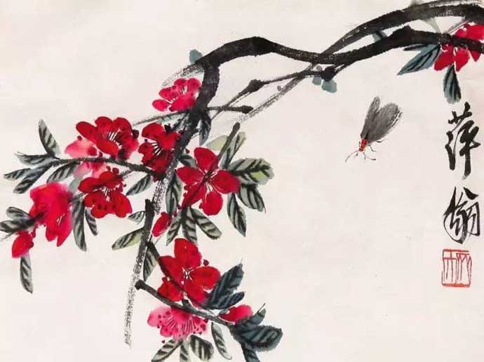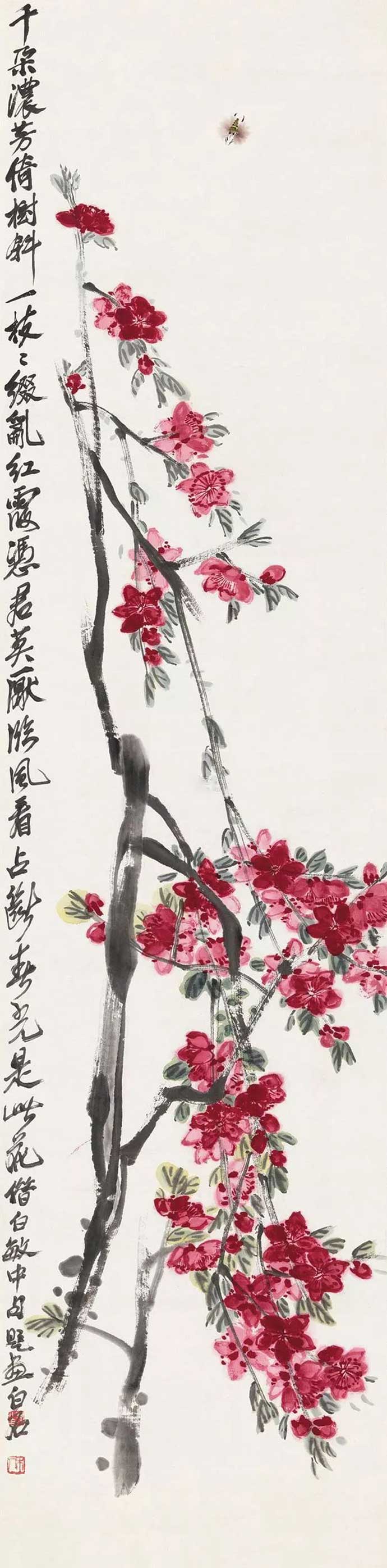 对于桃花,有人说过:“桃花,难画,因要画得它静。”纵观齐白石笔下的桃花,无论是大幅之作,还是尺幅小品,皆能于静处显境界,于艳处得气魄;大开大合,洒脱不拘;用浪漫手法,于豪放自如中尽显艳丽之姿态。白石老人笔下的桃花,绝无俗滥之感;在似与不似之间,极为准确地画出了桃花的灵魂。