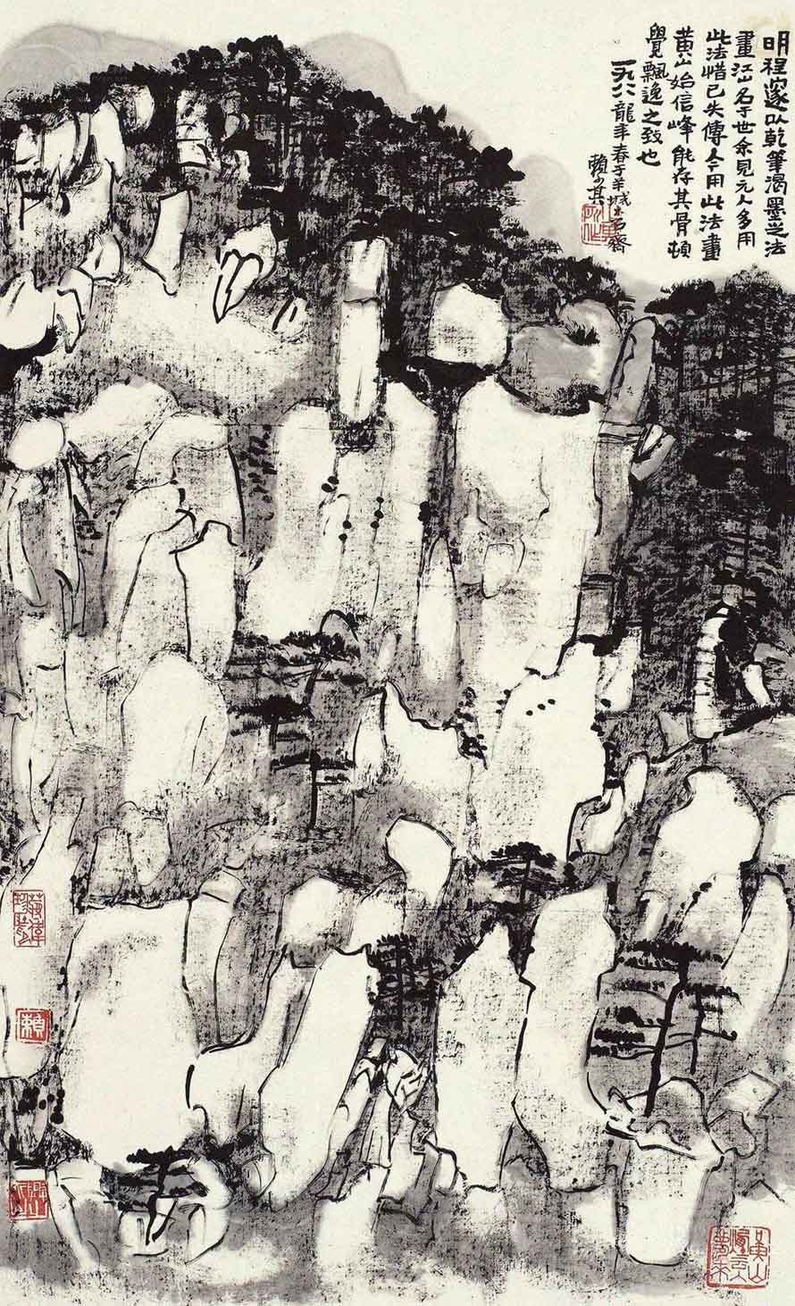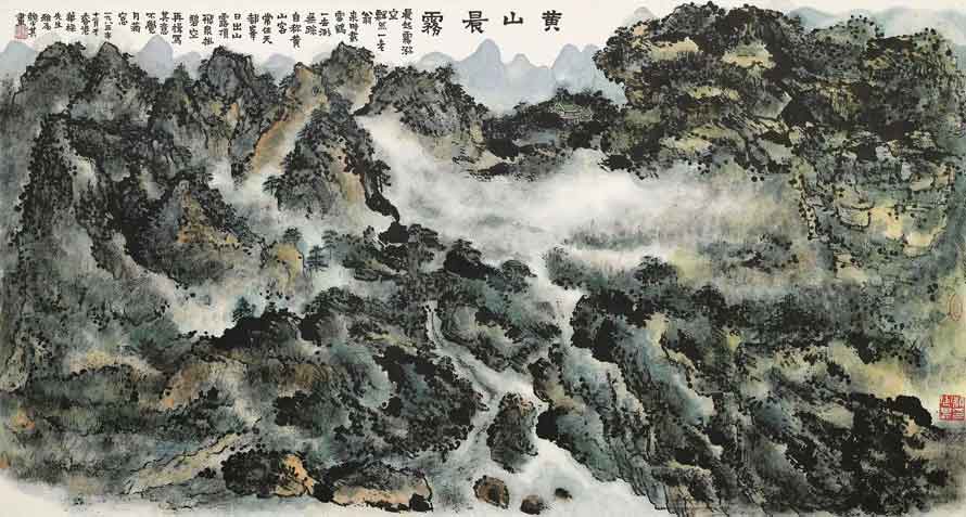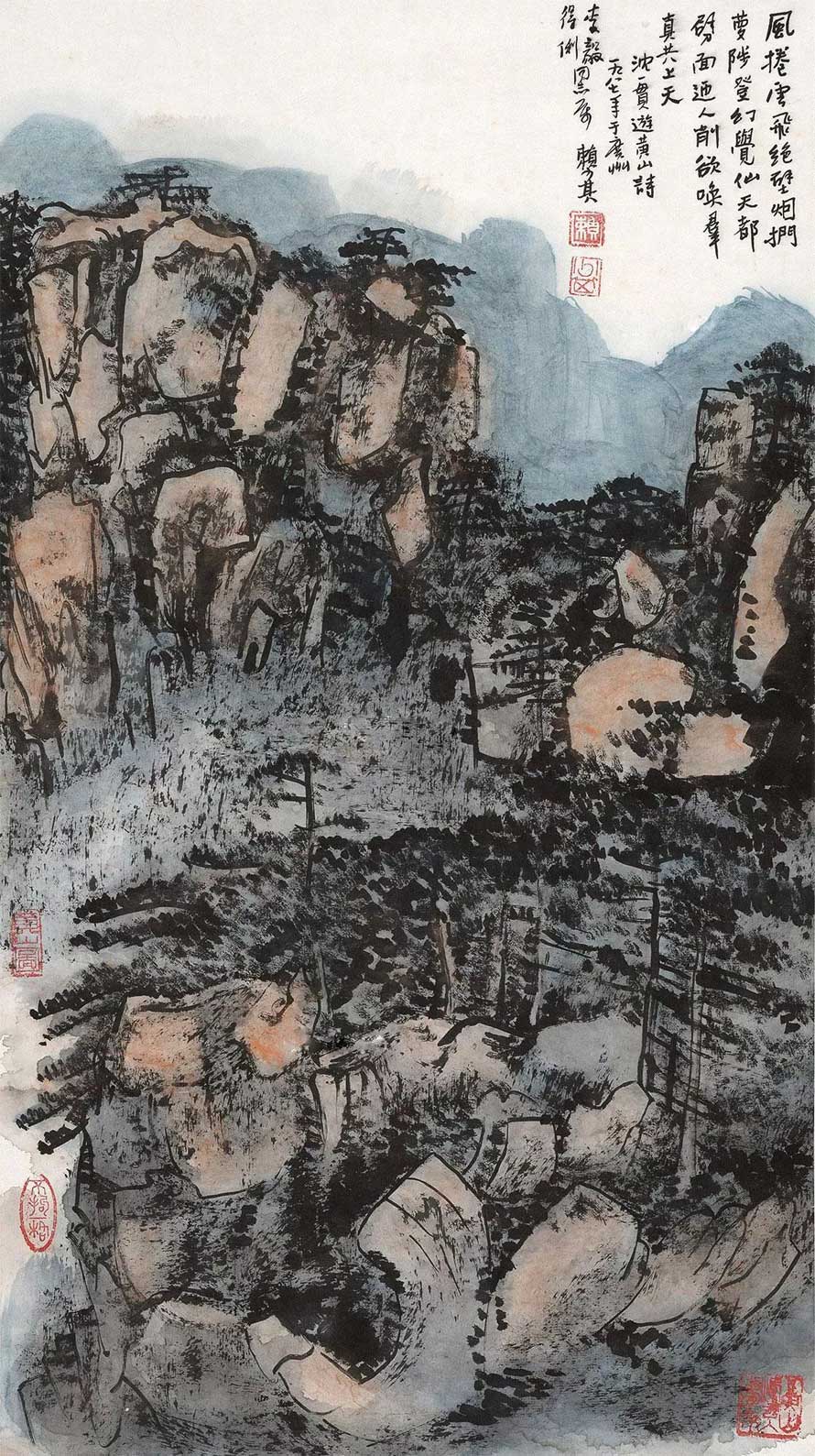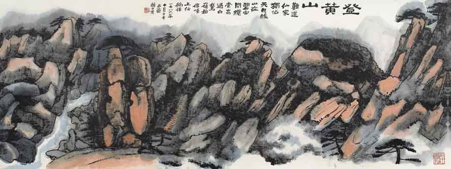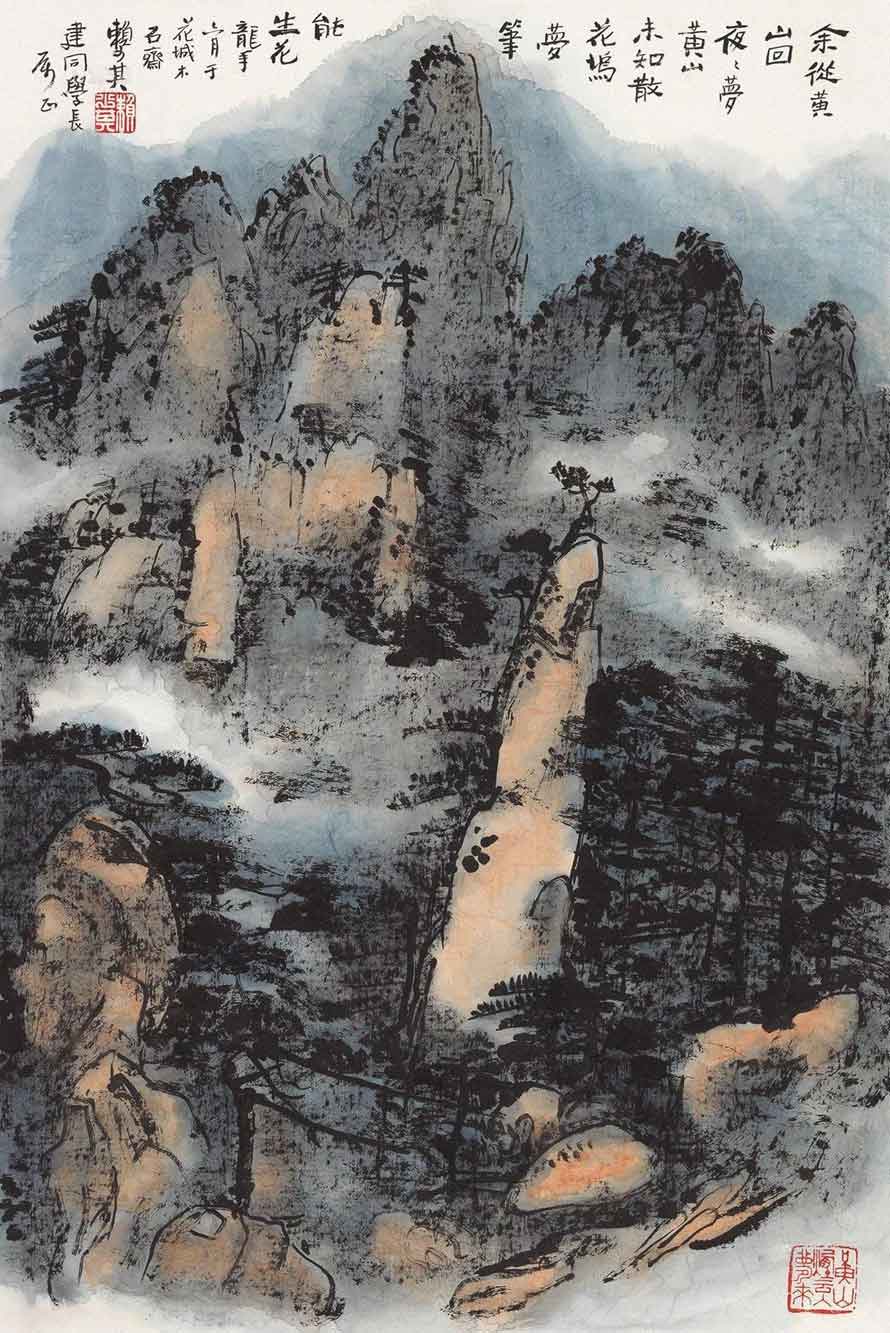 赖少其的学习路径与黄宾虹极为相似,却又有不同。他忠实地画黄山,也是“画从黄山出”;学黄宾虹画笔但从不仿其画,正在这“似与不似之间”,继承了黄宾虹艺术的精髓。1959年至1985年间,赖少其无数次深入黄山,以“黄山为师”,以“黄山为友”,自此开始了“师法自然”与“学习传统”相结合的山水画创作之路。他注重写生、“师造化”和笔势章法,面对奇松、怪石和云海的壮丽景色,以散点透视手法去累积素材,创作了大批反映黄山雄伟气势、独特审美情趣的作品。