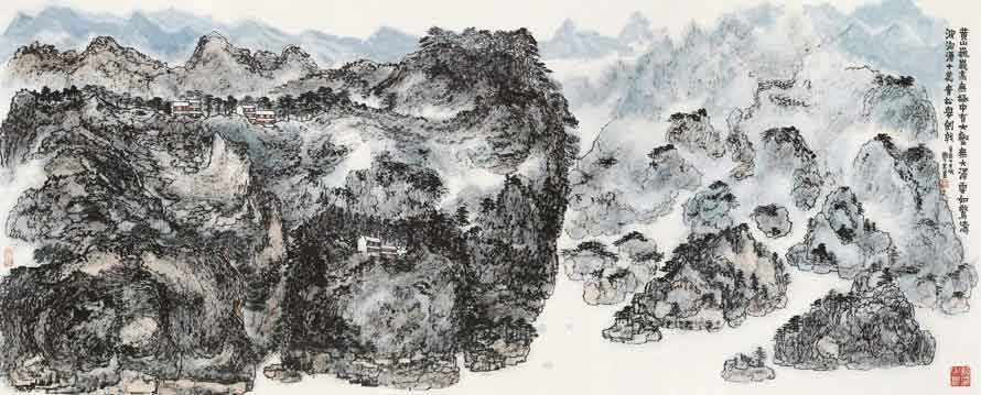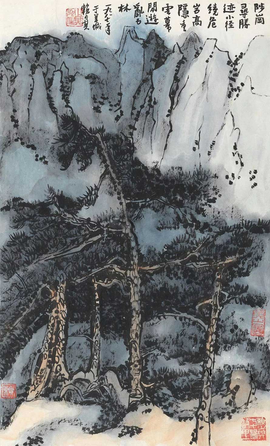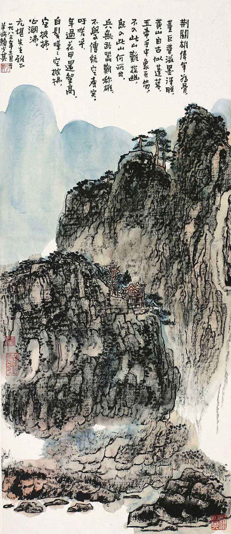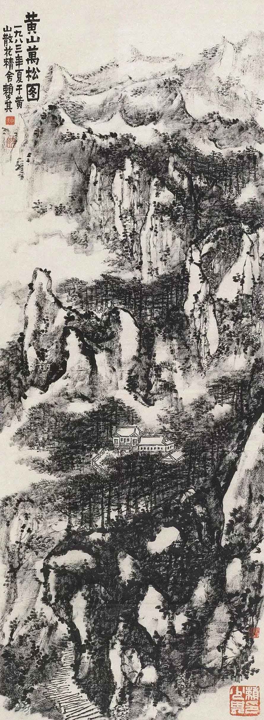 赖少其的学习路径与黄宾虹极为相似,却又有不同。他忠实地画黄山,也是“画从黄山出”;学黄宾虹画笔但从不仿其画,正在这“似与不似之间”,继承了黄宾虹艺术的精髓。1959年至1985年间,赖少其无数次深入黄山,以“黄山为师”,以“黄山为友”,自此开始了“师法自然”与“学习传统”相结合的山水画创作之路。他注重写生、“师造化”和笔势章法,面对奇松、怪石和云海的壮丽景色,以散点透视手法去累积素材,创作了大批反映黄山雄伟气势、独特审美情趣的作品。