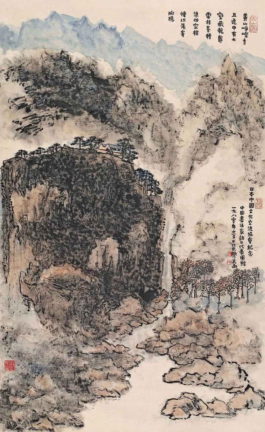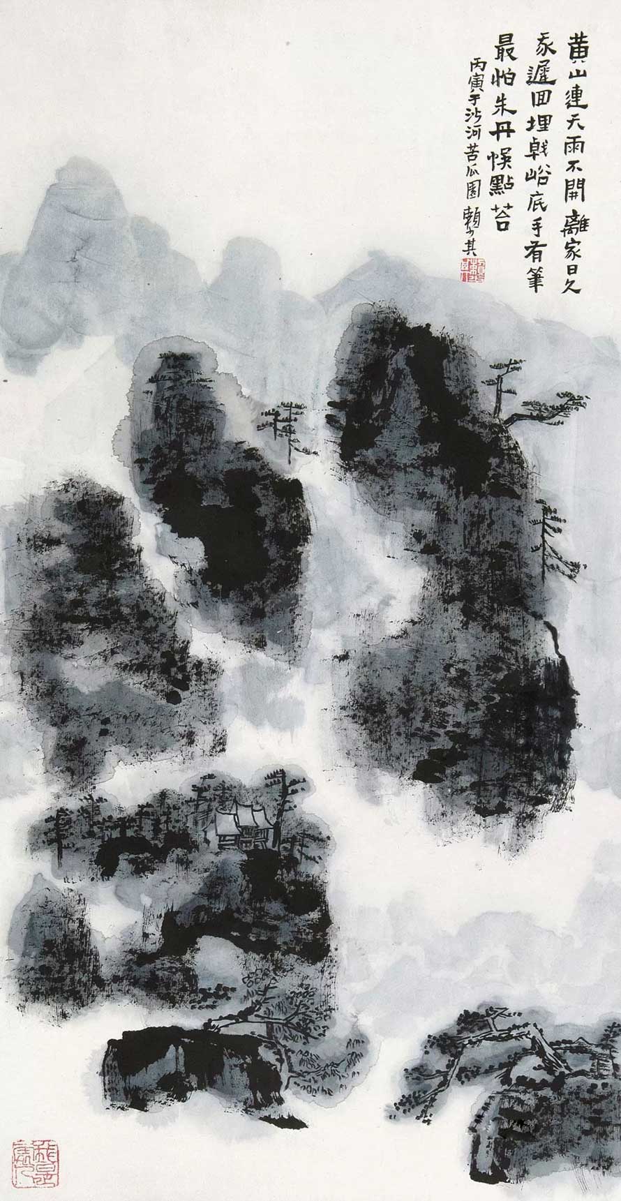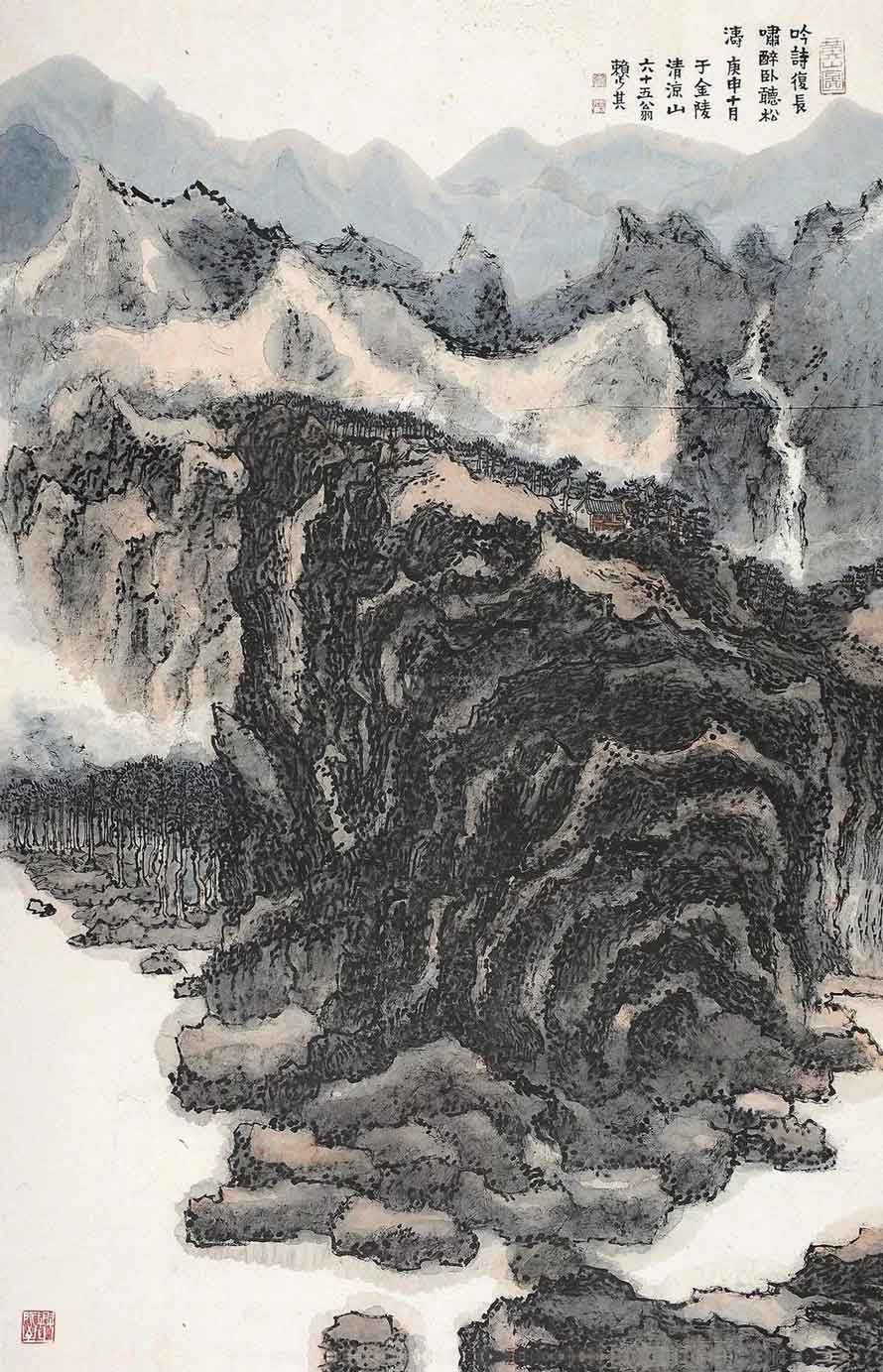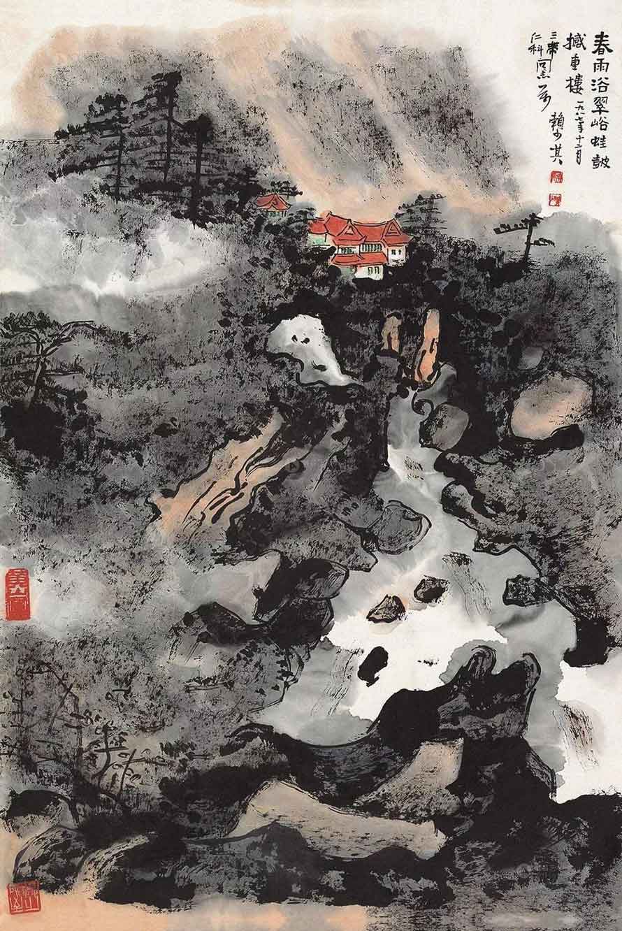 赖少其的学习路径与黄宾虹极为相似,却又有不同。他忠实地画黄山,也是“画从黄山出”;学黄宾虹画笔但从不仿其画,正在这“似与不似之间”,继承了黄宾虹艺术的精髓。1959年至1985年间,赖少其无数次深入黄山,以“黄山为师”,以“黄山为友”,自此开始了“师法自然”与“学习传统”相结合的山水画创作之路。他注重写生、“师造化”和笔势章法,面对奇松、怪石和云海的壮丽景色,以散点透视手法去累积素材,创作了大批反映黄山雄伟气势、独特审美情趣的作品。