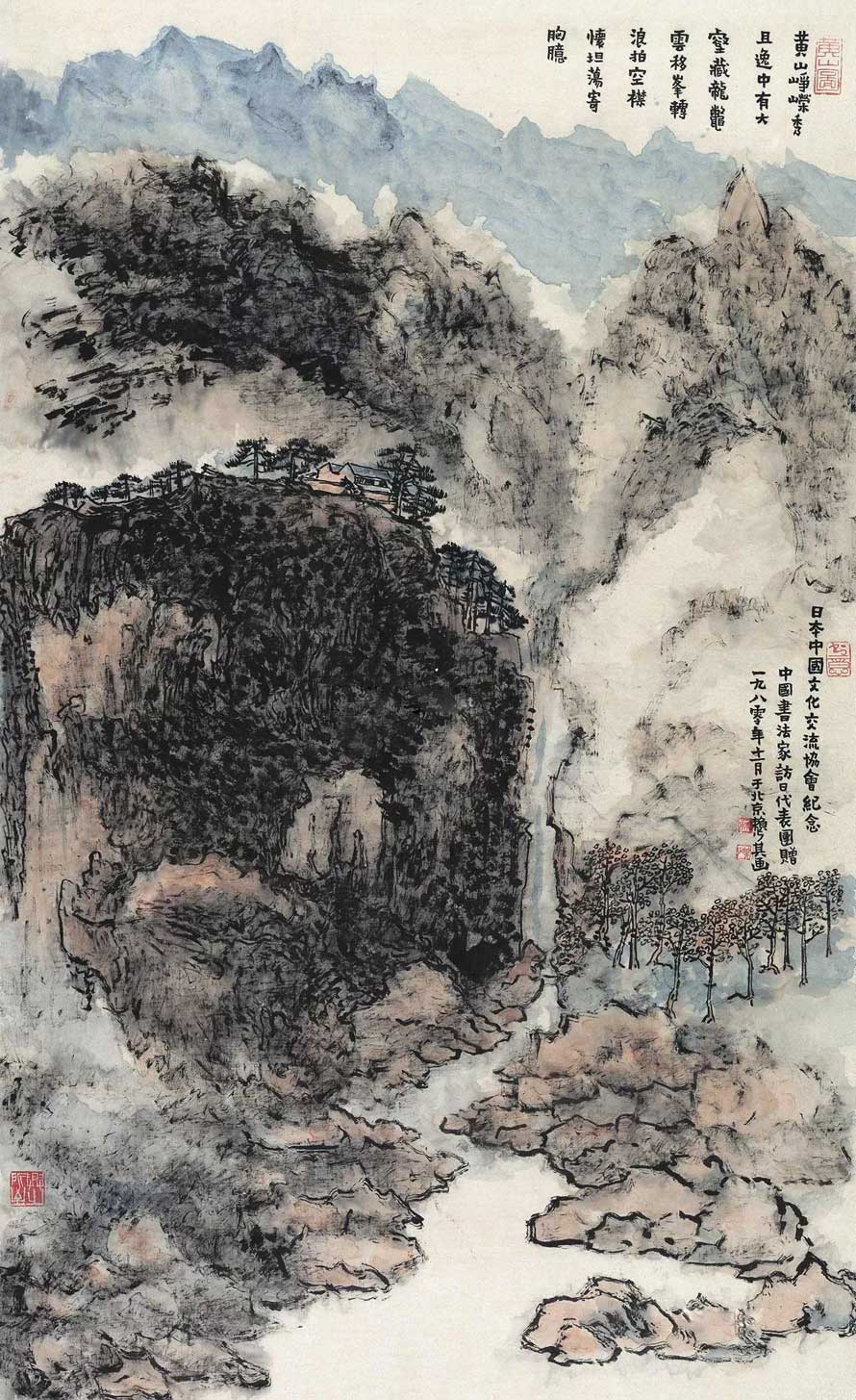 赖少其平生多少次上黄山,或者说在黄山待过多少时间,没有也很难精确统计,但可以断定中国现代画家能够与其比肩者罕见。仅他65岁那年即1980年4月至9月,约有半年时间他都在黄山作画,五上五下,先后作“丈二匹”大画11幅,中堂立轴70余幅,还写了不少幅书法。他上黄山作画之勤由此可见一斑。