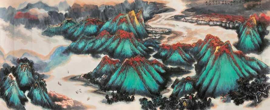 许多熟悉何老的人都会提到1984年何老被国家有关部门正式从西安调回北京以后,艺术生命衰年勃发,创造力井喷的现象。那确实是何海霞生命中最意气风发的一段时光。事实上时间还可以往前延伸几年,延伸到1976年。那一年他应文化部及各部委之邀,赴北京为***、***、钓鱼台国宾馆及各大饭店创作了多幅巨帧山水画。从那一年开始,他的主要生活与创作的时间都已经北移京师。在这些年里,他创作了《大地长春》、《爱我河山》、《大地一统锦绣山河》等宏篇巨构,吞吐山川、气势磅礴、金碧辉煌、意境阔远,表现出拥抱时代的大视野、大气象、大格局。