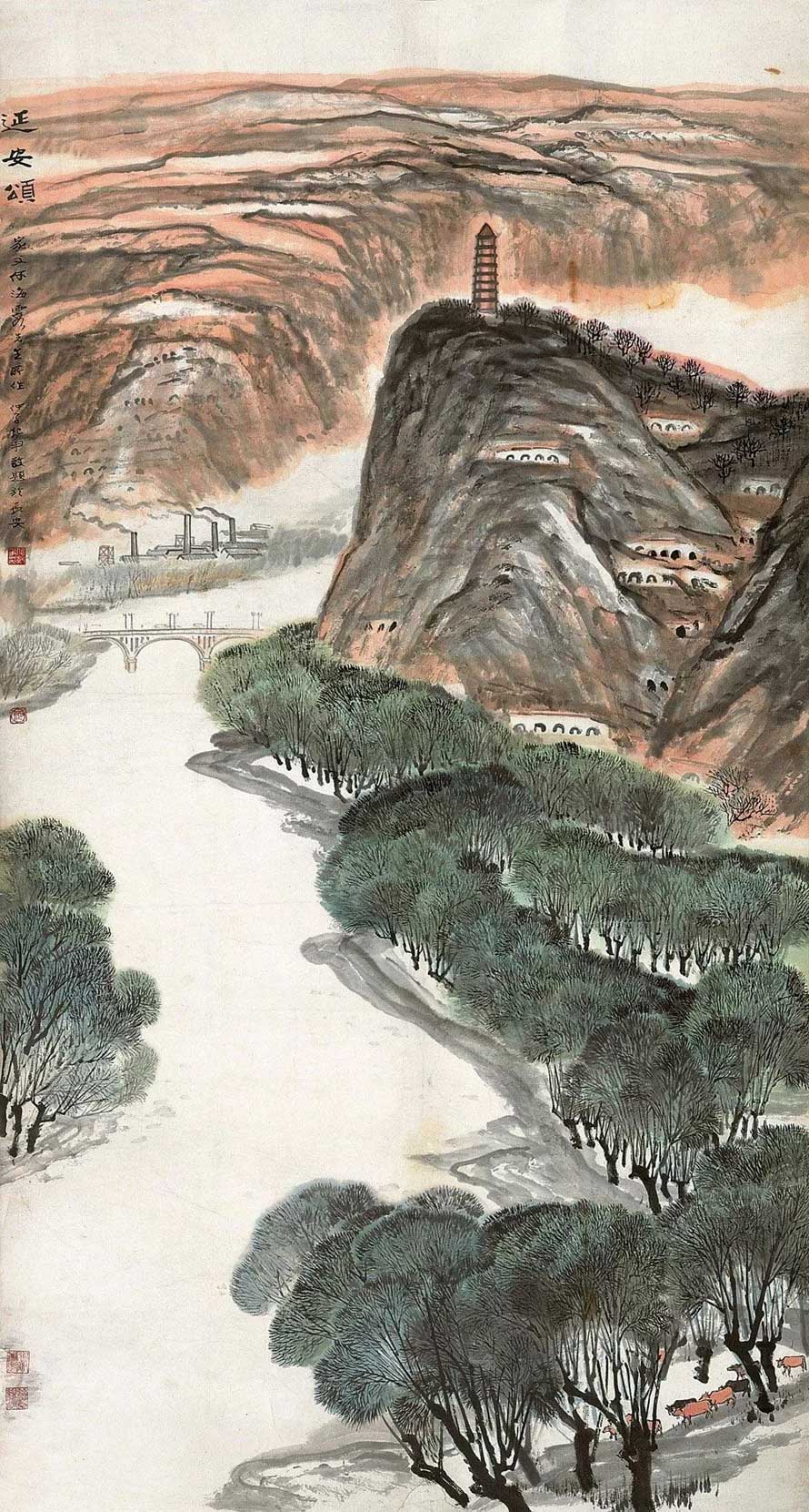 新中国成立后,海霞长期在西安工作,和赵望云、石鲁等画家一道深入生活,满怀激情地用画笔歌颂祖国壮丽江山和社会主义建设。思想的变化带来了艺术的开拓,他突破了旧传统的藩篱,进入山水画创作的新天地。赵望云的朴实和石鲁的旷悍也揉进了他原来的潇洒典雅的画风之中,体现了时代精神,成为长安画派的创立人之一。如果不在这块有着古老文明和壮阔河岳的八百里秦川扎根,和人民同心共命,海霞笔下的山水何能如此深沉感人,体现出民族的、乡土的、时代的精神,成为又一代开宗立派的山水画大师呢!