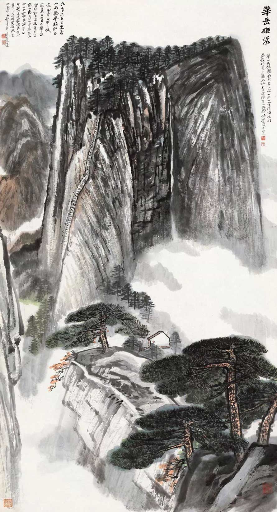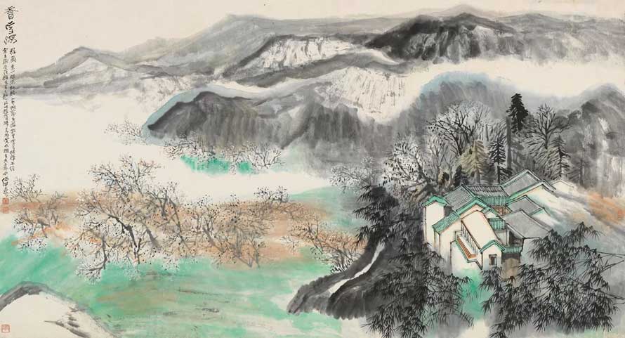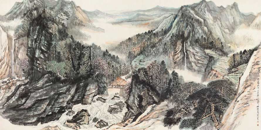 他可以泼墨大写,气势磅礴;也可以重彩工笔,金碧辉煌。他可以使墨如彩;也可以使彩如墨。他可以千笔万笔不觉其多;也可以两笔三笔不觉其少。他可以追荆(浩)、关(仝)、李(成)、范(宽)之精严;也可以比八大、石涛之放逸。他可以临摹古迹,落笔乱真;也可以自出机抒,一空依傍。他可以冶南北于一炉;也可融东西为一体。他可以优入古人法度而具现代精神;也可以用现代手法而不隳传统。……如此等等。