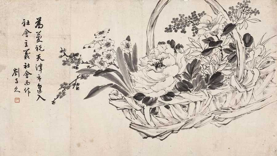 刘子久(1891-1975),别名饮湖、光城,天津人,人民美术教育家、博物学家。 初学测量,继嗜国画。受教于金北楼。1920年在北京中国画研究会学山水、花卉。1927年参加湖社画会,任导师。1937年以来任天津市美术馆秘书,创办国画研究班,从事国画创作和教学20余年。曾任天津市美术馆馆长、中国美术家协会天津分会副主席、中国美术家协会理事。代表性作品有《支援前线》、《给军属拜年》、《长城放牧》、《为祖国寻找宝藏》、《冒雨铺轨》等。