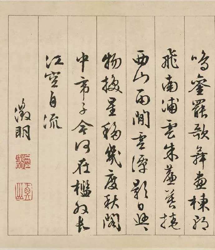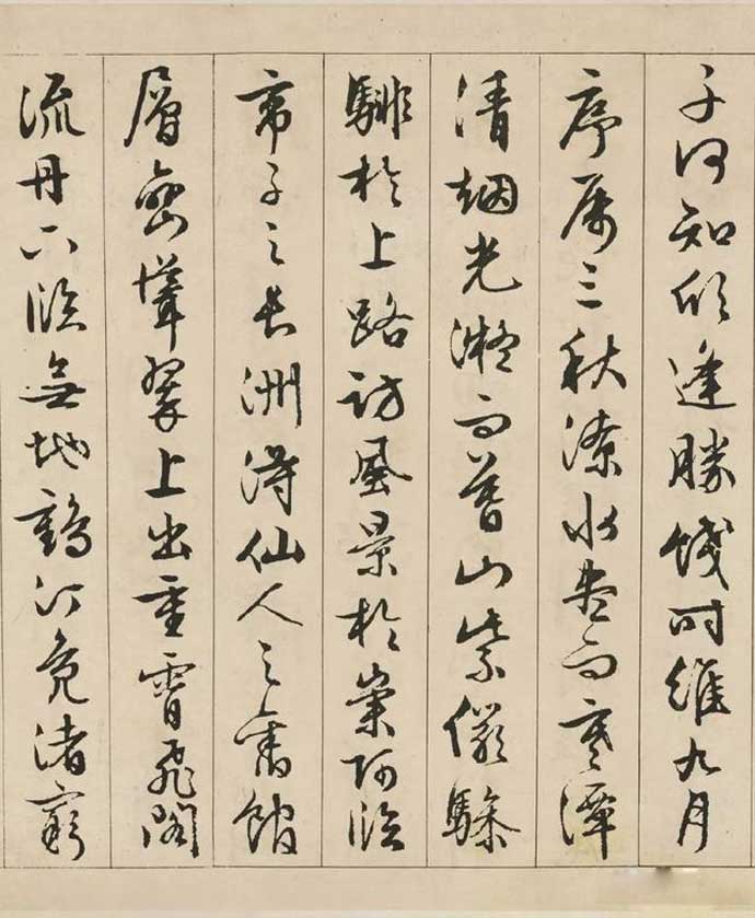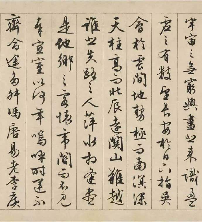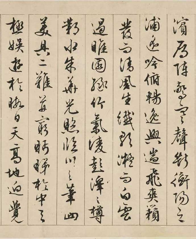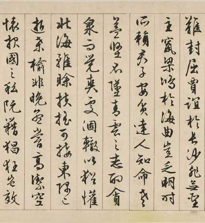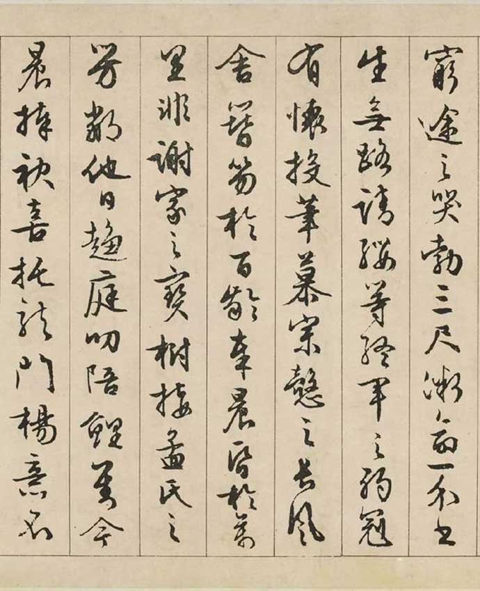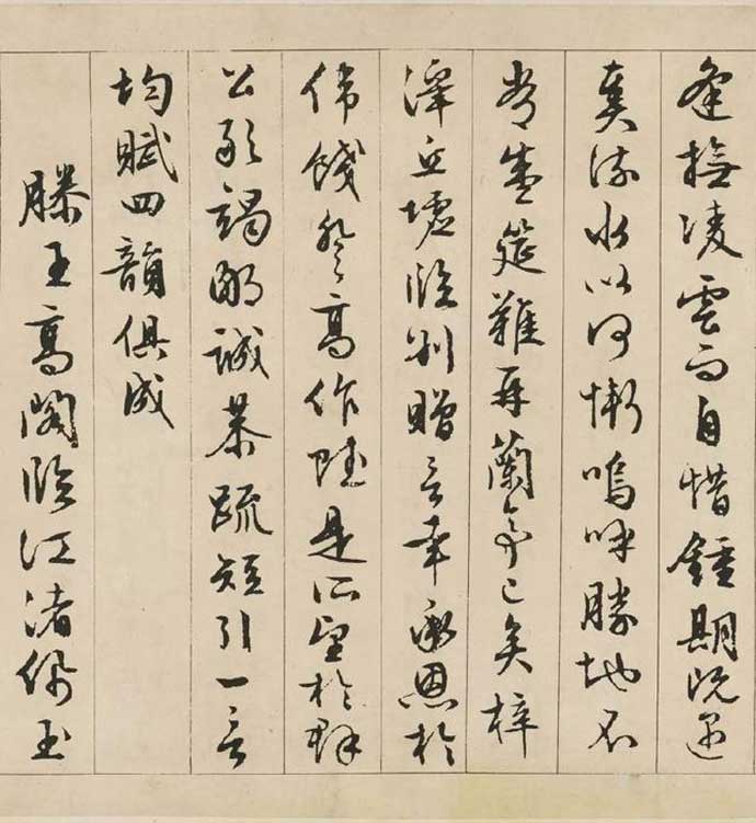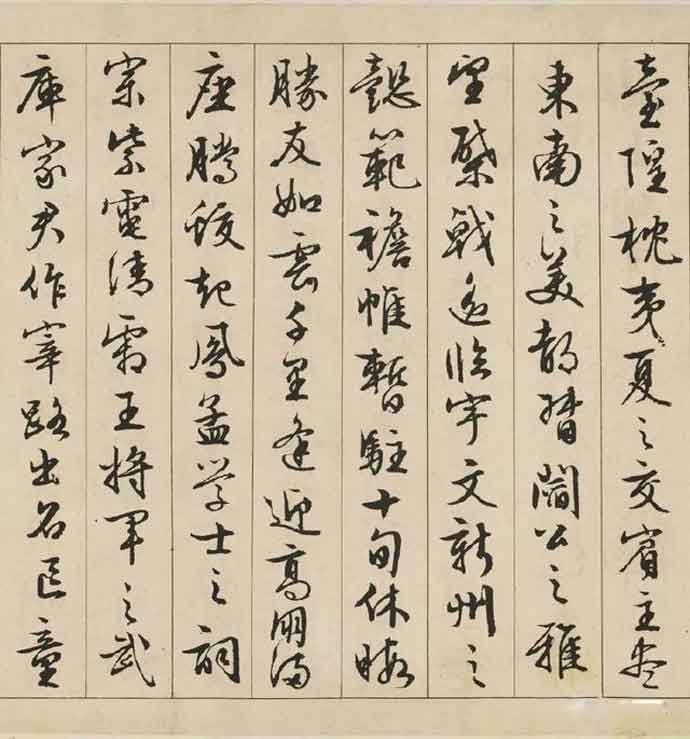 他的《滕王阁赋》,行草羼杂,浑然成篇。用笔清爽劲利,圆熟流畅,提按顿挫明晰,使转灵活利落,淋漓痛快而富有韵律感,颇有《圣教序》意味。有些字的用笔和结体又有宋元人的影子,如撇、捺及『门』、『页』等偏旁部首均袭赵孟頫而出。点画掩映间一派潇洒秀逸的风姿,又不失古澹闲雅的韵味,称之为韵法两胜,当不为过。文征明的行草大都书于尺牍文稿之上,字体属中、小字。偶作大字,多师法宋代黄庭坚,深得其昂藏郁拔之姿韵。纵观他的全部作品,我们可以看到,有些抒发性情个性的,他从正宗的二王风范中化出的自家面目书家,字体趋于中、小类;而书写气度恢宏的大字时,则专出之以风格鲜明的山谷之体,『如凤舞琼花,泉鸣竹涧』。文征明的字能大能小,大小俱佳。