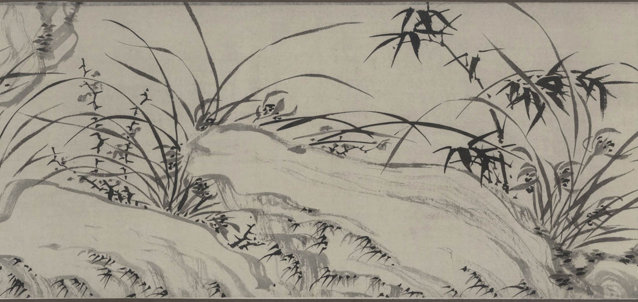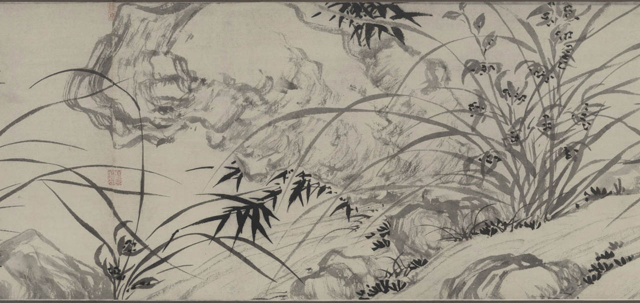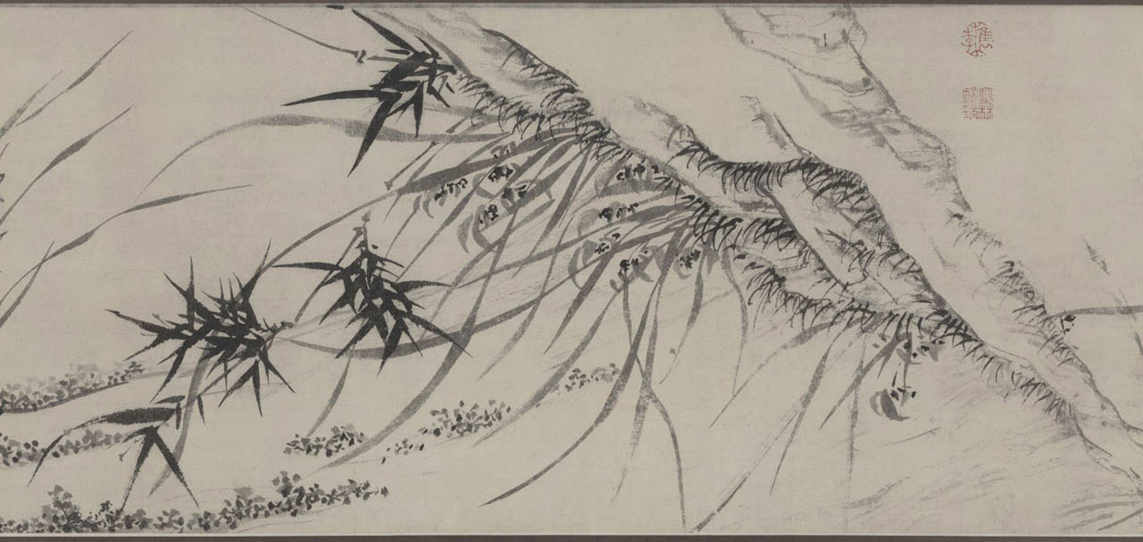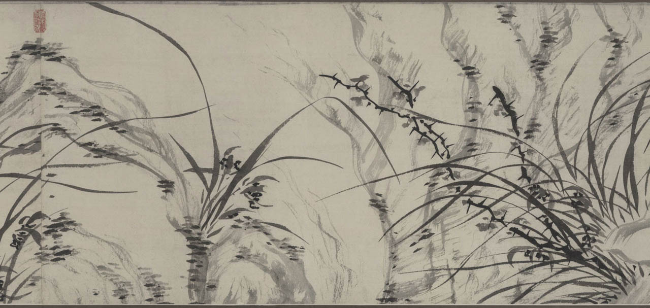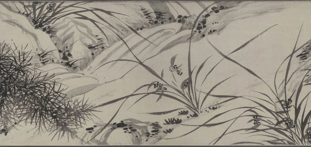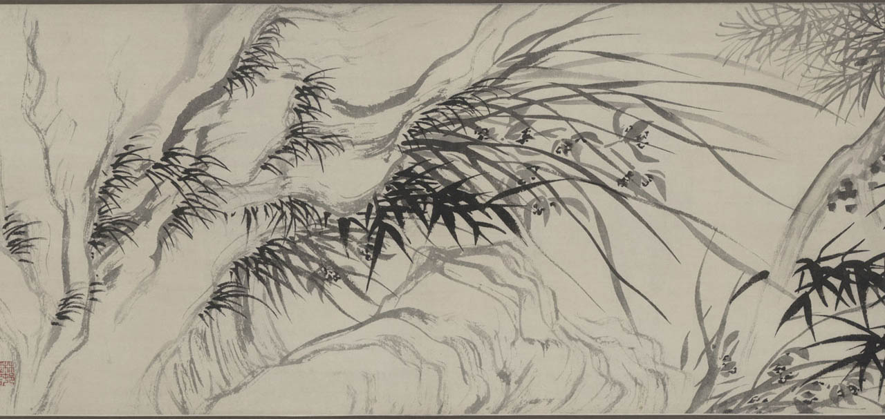此长卷画,画得极有特色,在主要描绘山、兰、松、石的同时,还延之以洲渚坡陀,气派宏大。刻画竹、石、兰、松等各种情态,应有尽有,间杂以怪石、古松、劲草等。穿插起落,合情合理,整个画卷法度谨严,意态潇洒,其偃卧、疏密、浓淡均合矩莅,引人入境。