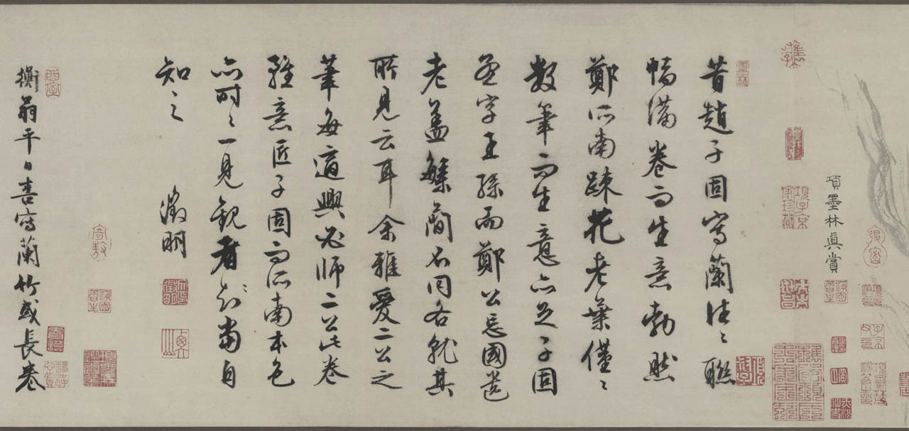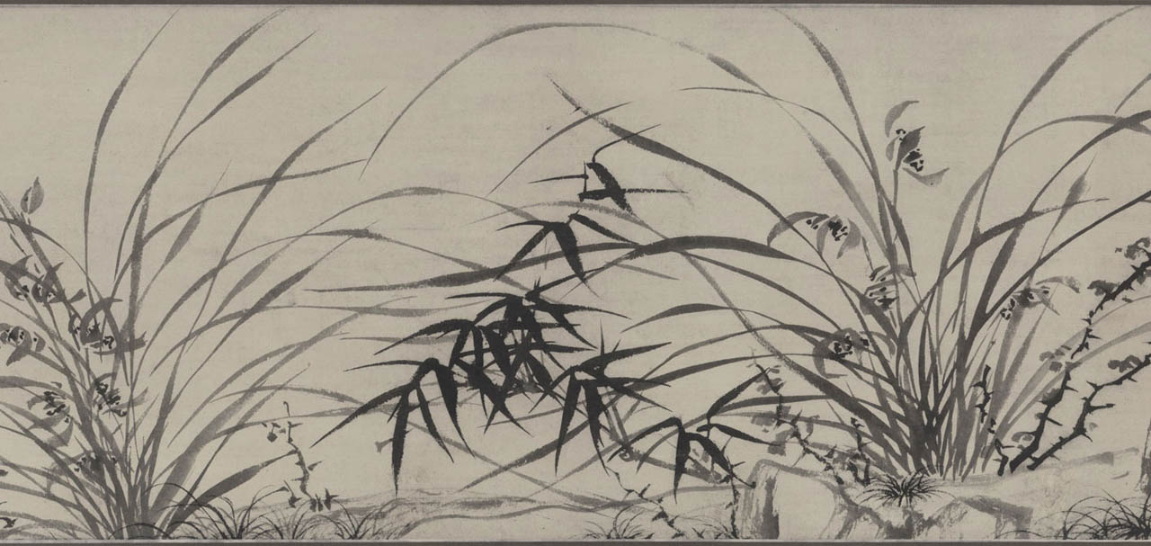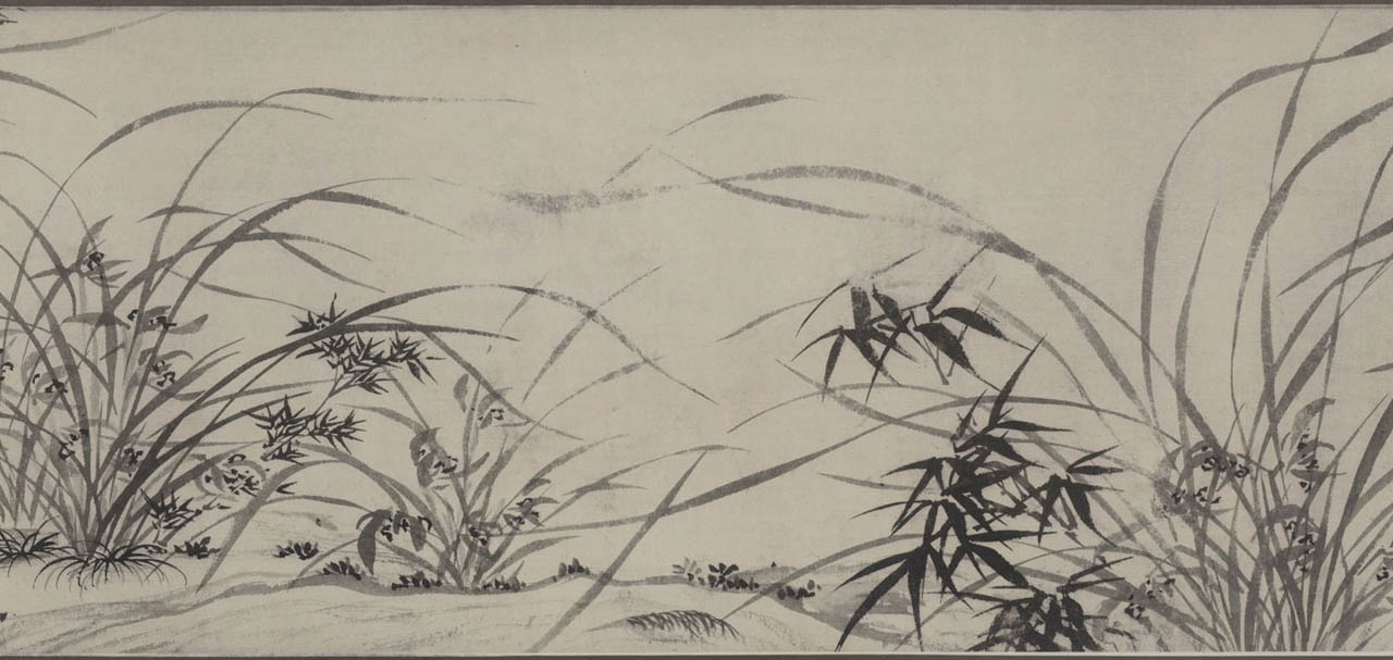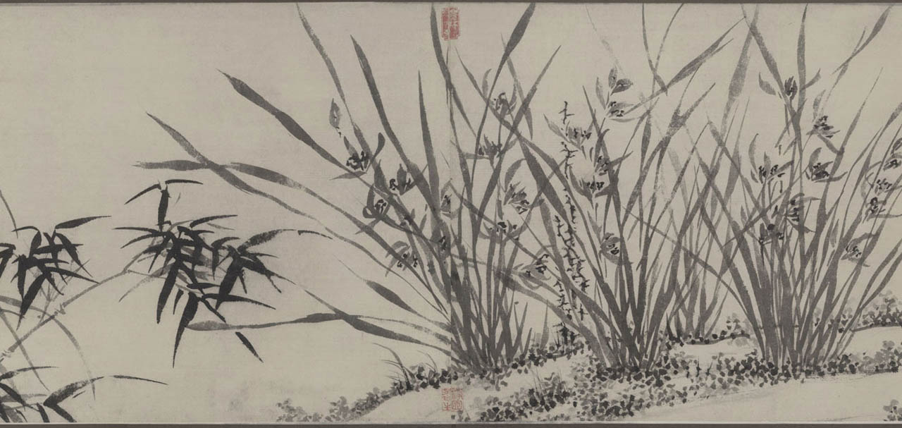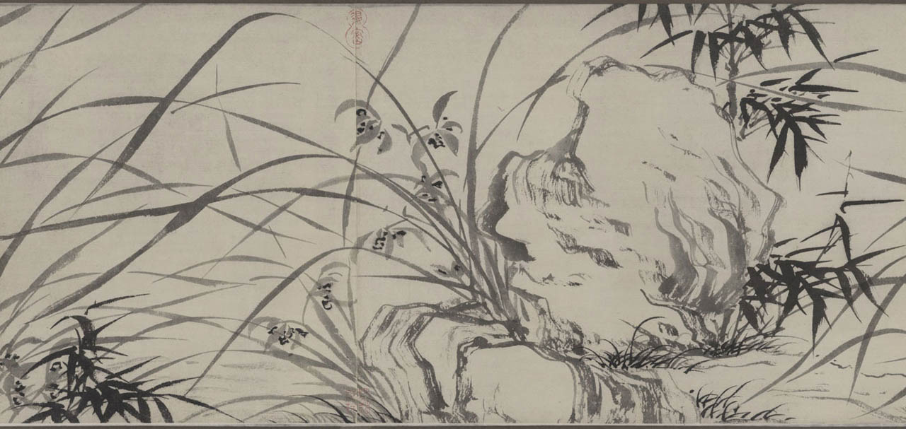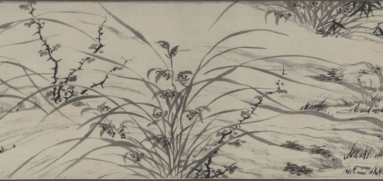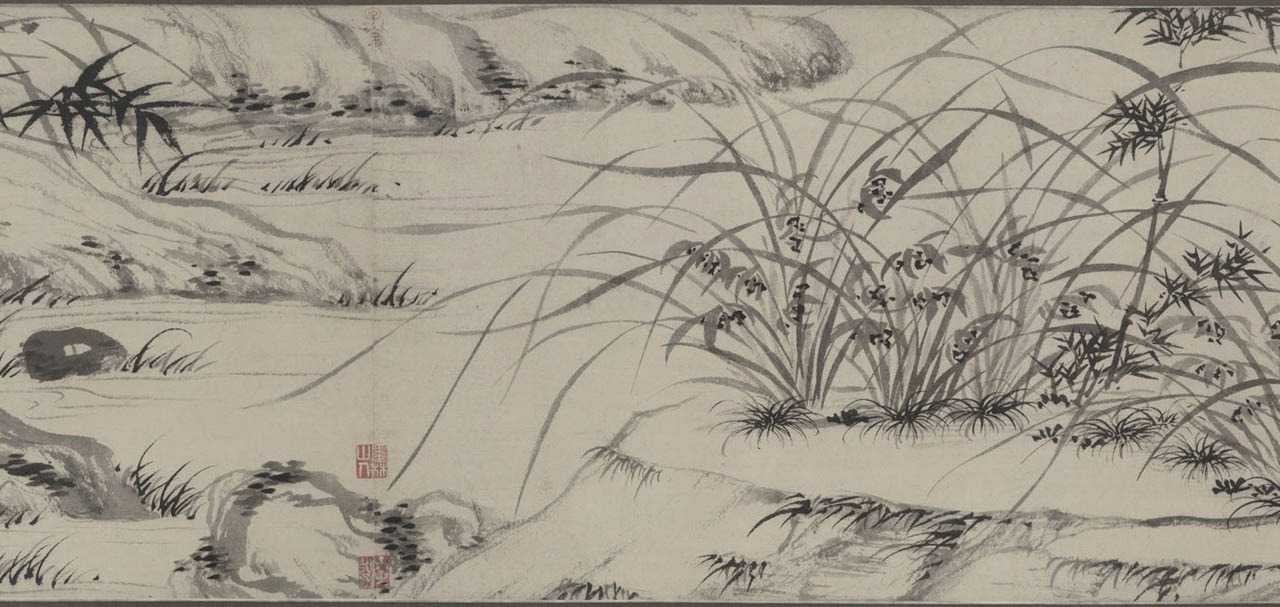 此长卷画,画得极有特色,在主要描绘山、兰、松、石的同时,还延之以洲渚坡陀,气派宏大。刻画竹、石、兰、松等各种情态,应有尽有,间杂以怪石、古松、劲草等。穿插起落,合情合理,整个画卷法度谨严,意态潇洒,其偃卧、疏密、浓淡均合矩莅,引人入境。