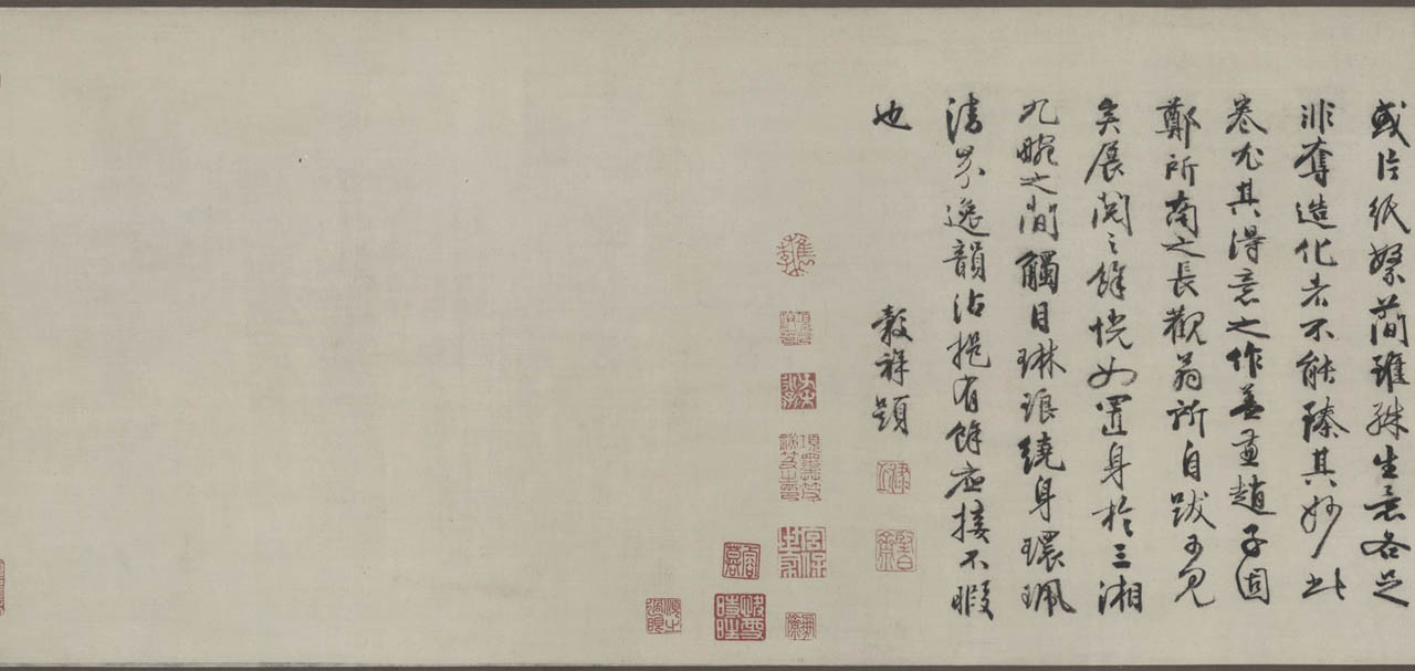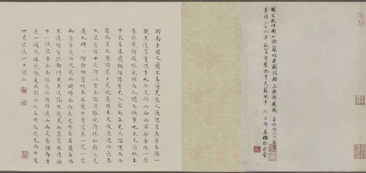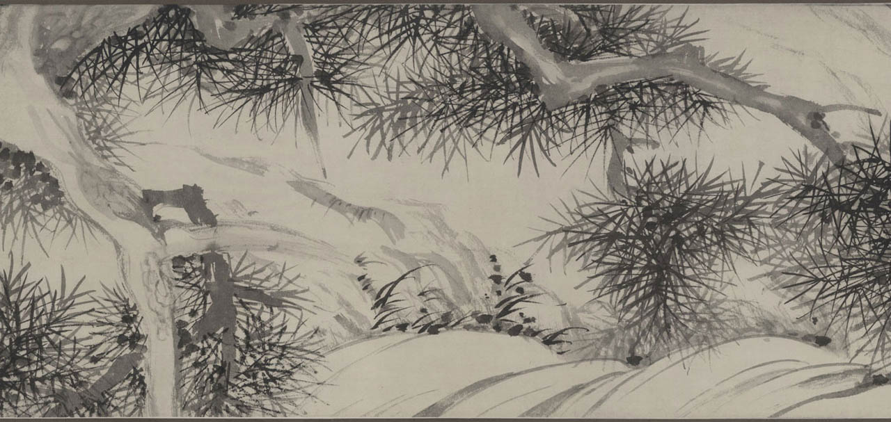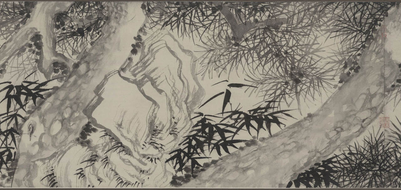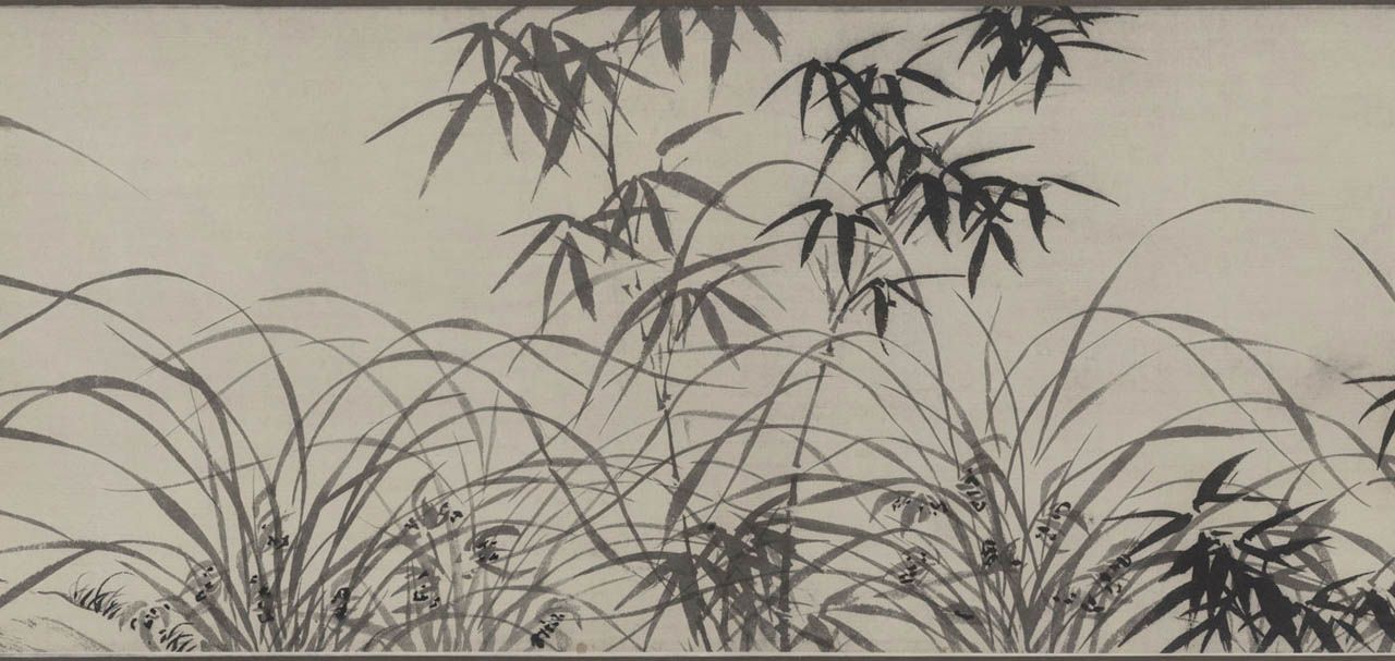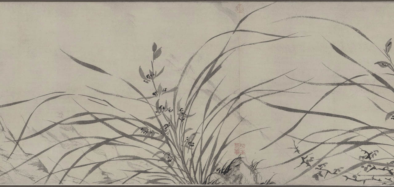 此长卷画,画得极有特色,在主要描绘山、兰、松、石的同时,还延之以洲渚坡陀,气派宏大。刻画竹、石、兰、松等各种情态,应有尽有,间杂以怪石、古松、劲草等。穿插起落,合情合理,整个画卷法度谨严,意态潇洒,其偃卧、疏密、浓淡均合矩莅,引人入境。