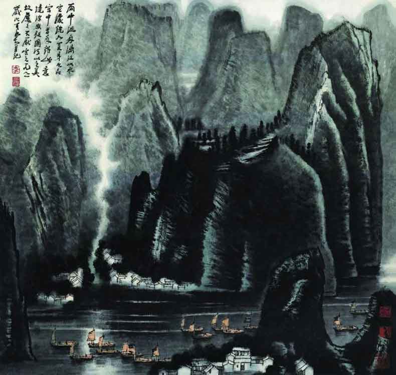 第二件是李可染的《雨中泛舟》(图2),系作者晚年忆往昔泛舟漓江时的胜境而绘制的诸多漓江山水画作之一。作者将天空染暗,表现雨中漓江,使作品具有一种朦胧迷茫、流光徘徊的美感。尽管乌云密布、雨水来袭,漓江中的船只仍川流不息,两岸山脚下密布民居,意境空蒙。