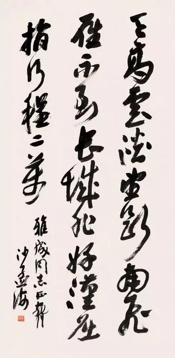 林散之是由楷而行,由行而草,间作汉隶;沙孟海则正、行、篆、隶、草,无所不攻;林散之草书由怀素、王铎而出,大草与小草兼杂,不和严格意义上的狂草。直接承袭了黄宾虹的艺术思想。
