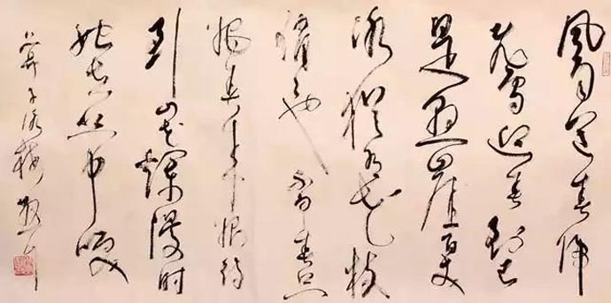 林散之老师走的是帖学的路子,他的成功是将汉隶与大草相结合,草书以怀素为宗,确立了自己的风格。所作草书,如行云,似流水,灵动潇洒,隽逸优美。