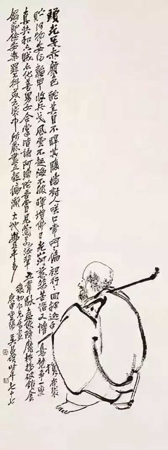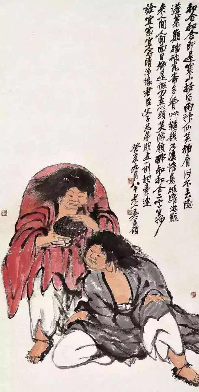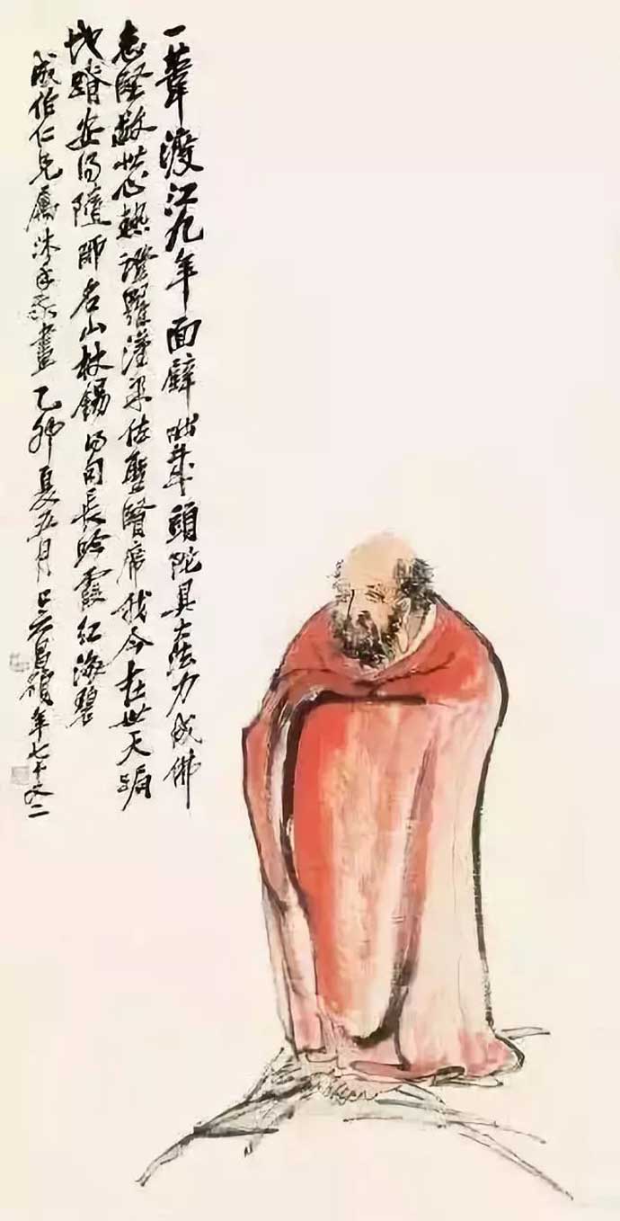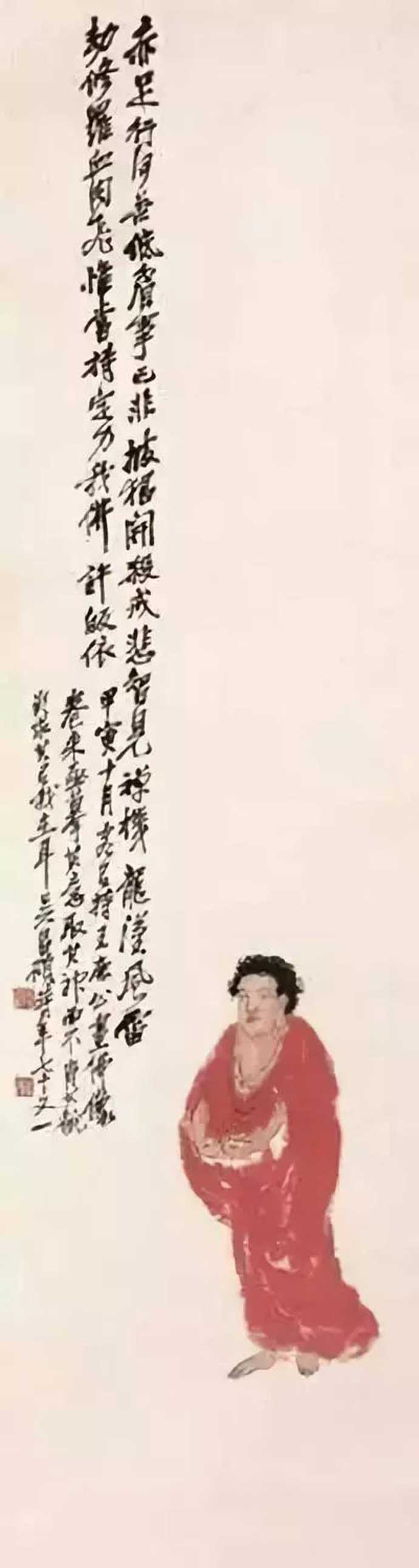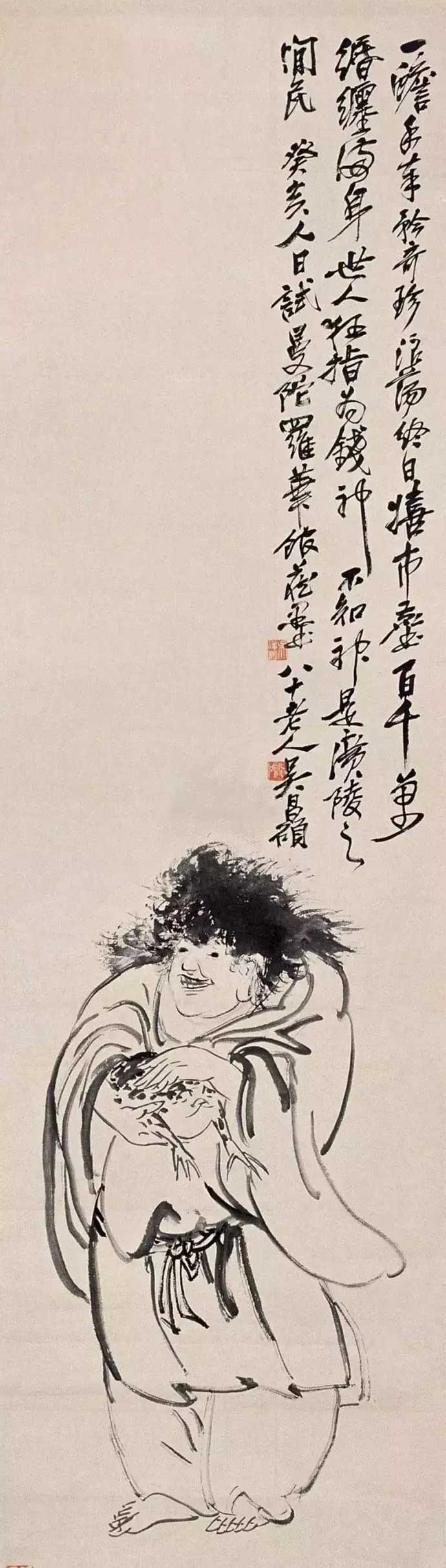 吴昌硕先生的人物画所勾衣纹线条直接取自书法,中年多出以篆籀之笔,古拙凝重,晚年系用草篆之笔,粗犷苍劲。多绘佛教人物,如观音,达摩,弥勒。也画锺馗。尝题人物画云:“取其神,而不肖其貌,欲求其有我在耳。”