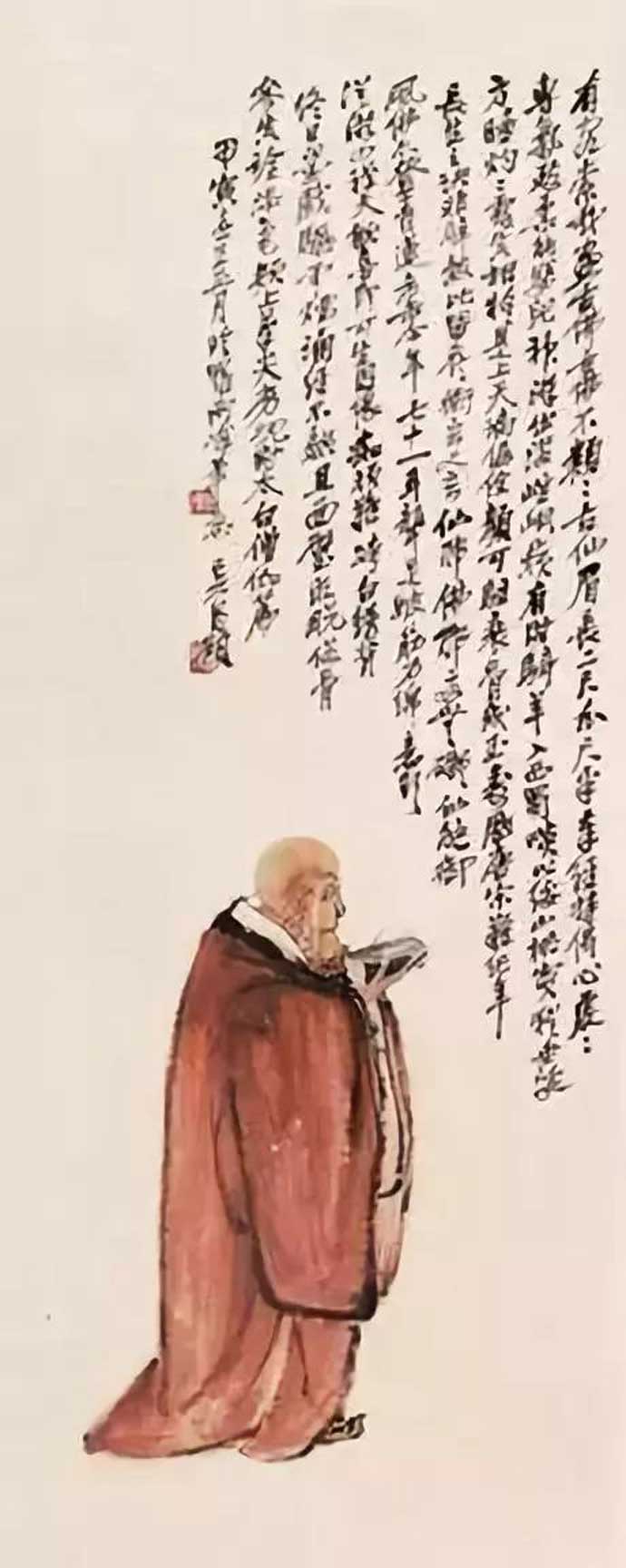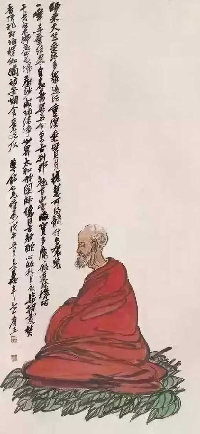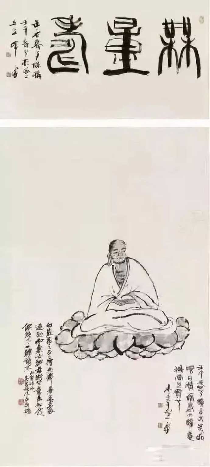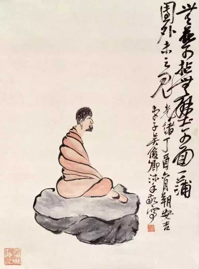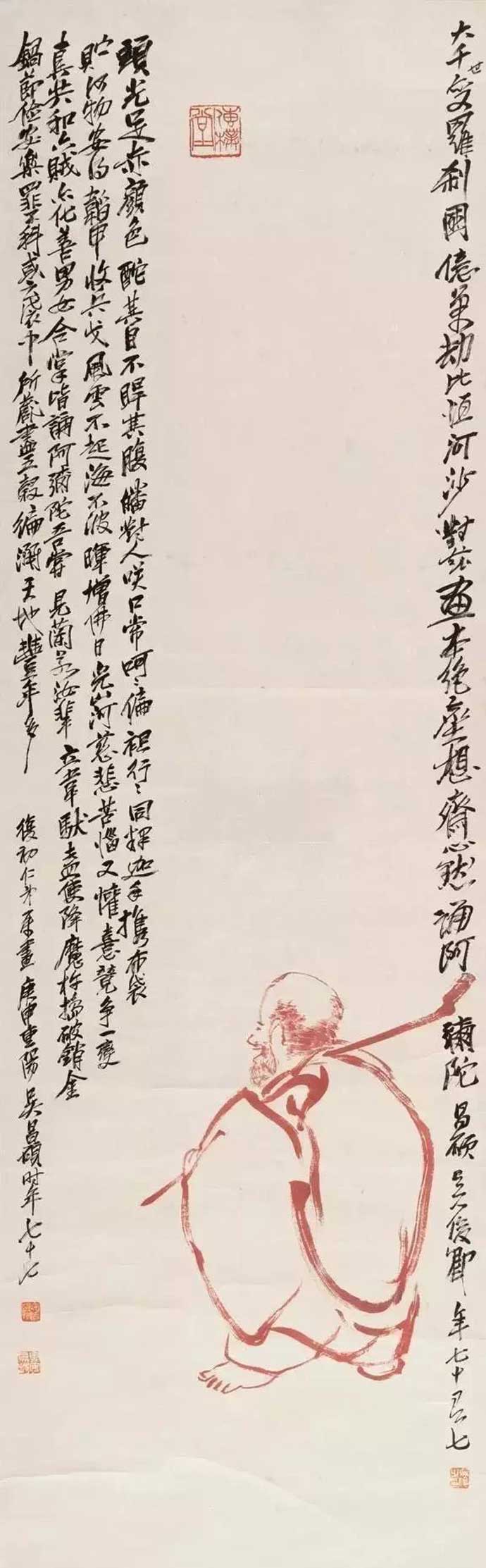 吴昌硕先生的人物画所勾衣纹线条直接取自书法,中年多出以篆籀之笔,古拙凝重,晚年系用草篆之笔,粗犷苍劲。多绘佛教人物,如观音,达摩,弥勒。也画锺馗。尝题人物画云:“取其神,而不肖其貌,欲求其有我在耳。”