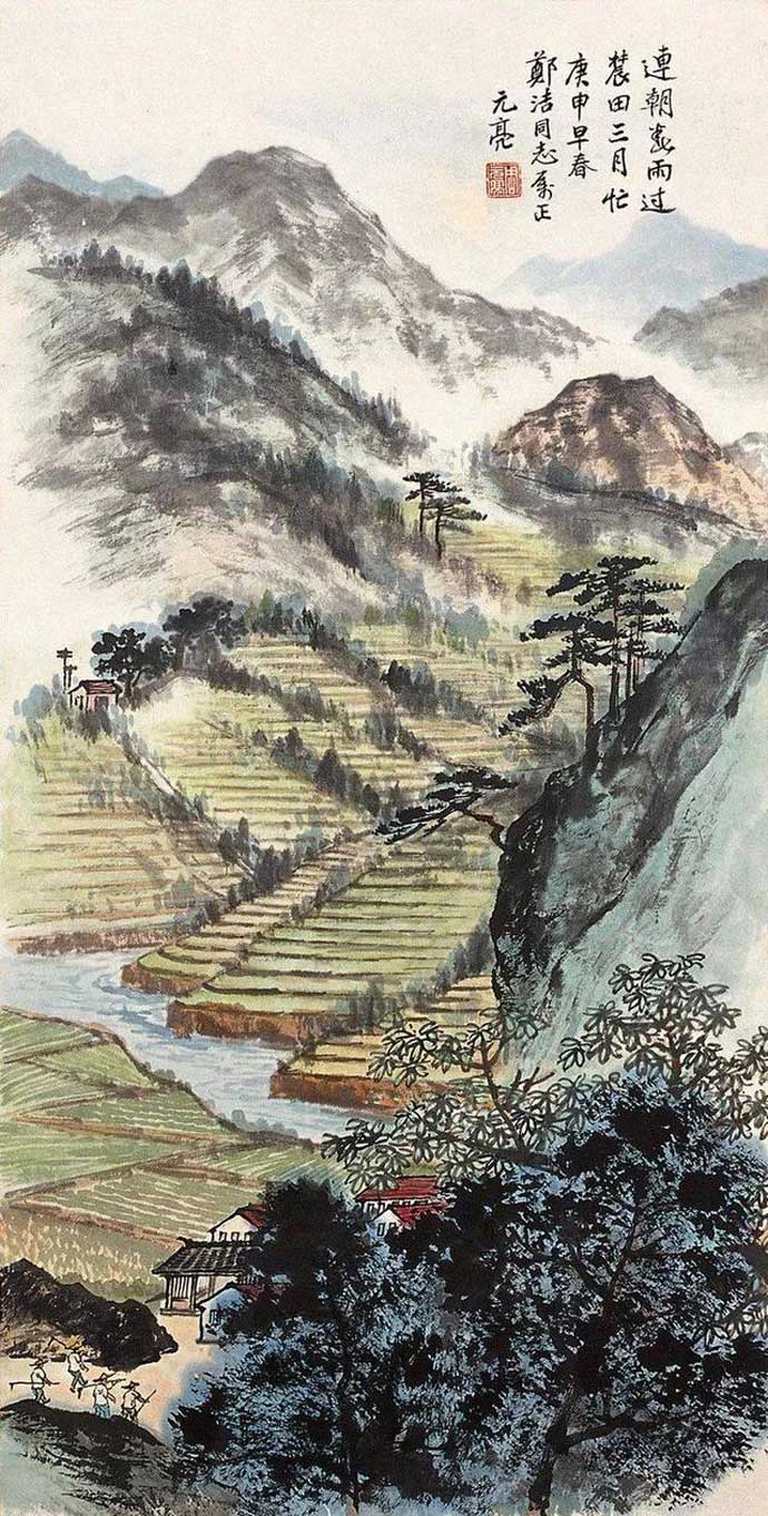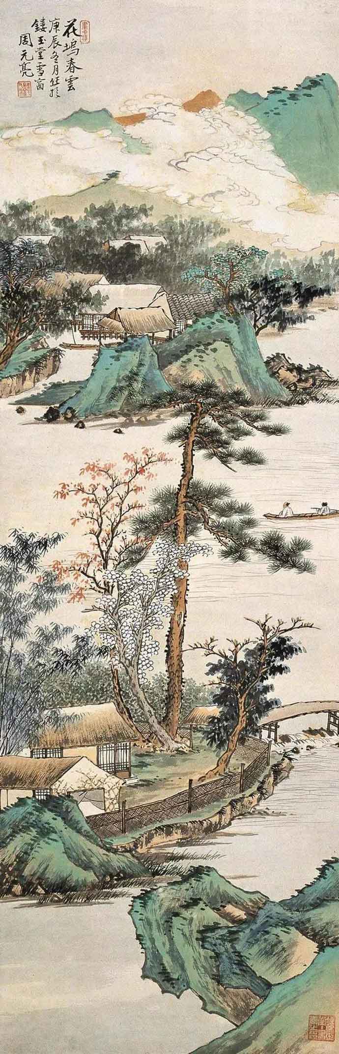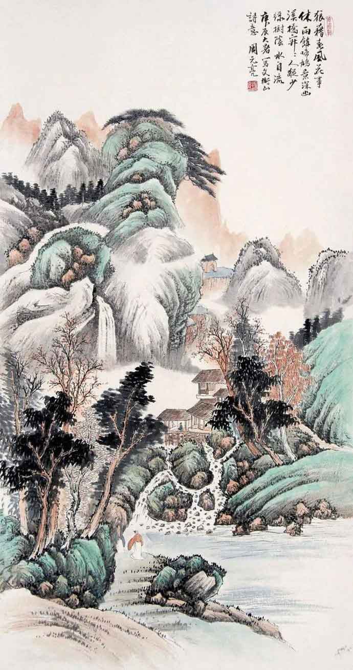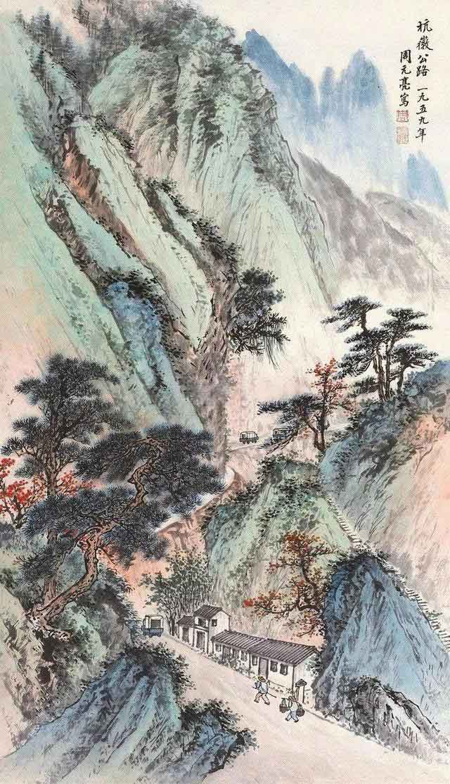 周元亮(1903-1995)字容庵。北京人。为中国美协会员,北京画院一级美术师。周元亮作品构图严谨,写景稠密,画风清雅脱俗。兼工花卉,所画梅、竹清新隽秀。他是北派著名画家,艺术造诣高深,从“四王”山水入手,进而上溯宋元明诸大家,潜心古代传统。在继承传统的基础上,他的作品很有现代风貌,他的作品里常常出现汽车、田园以及劳作的人们等,很有现代生活气息。