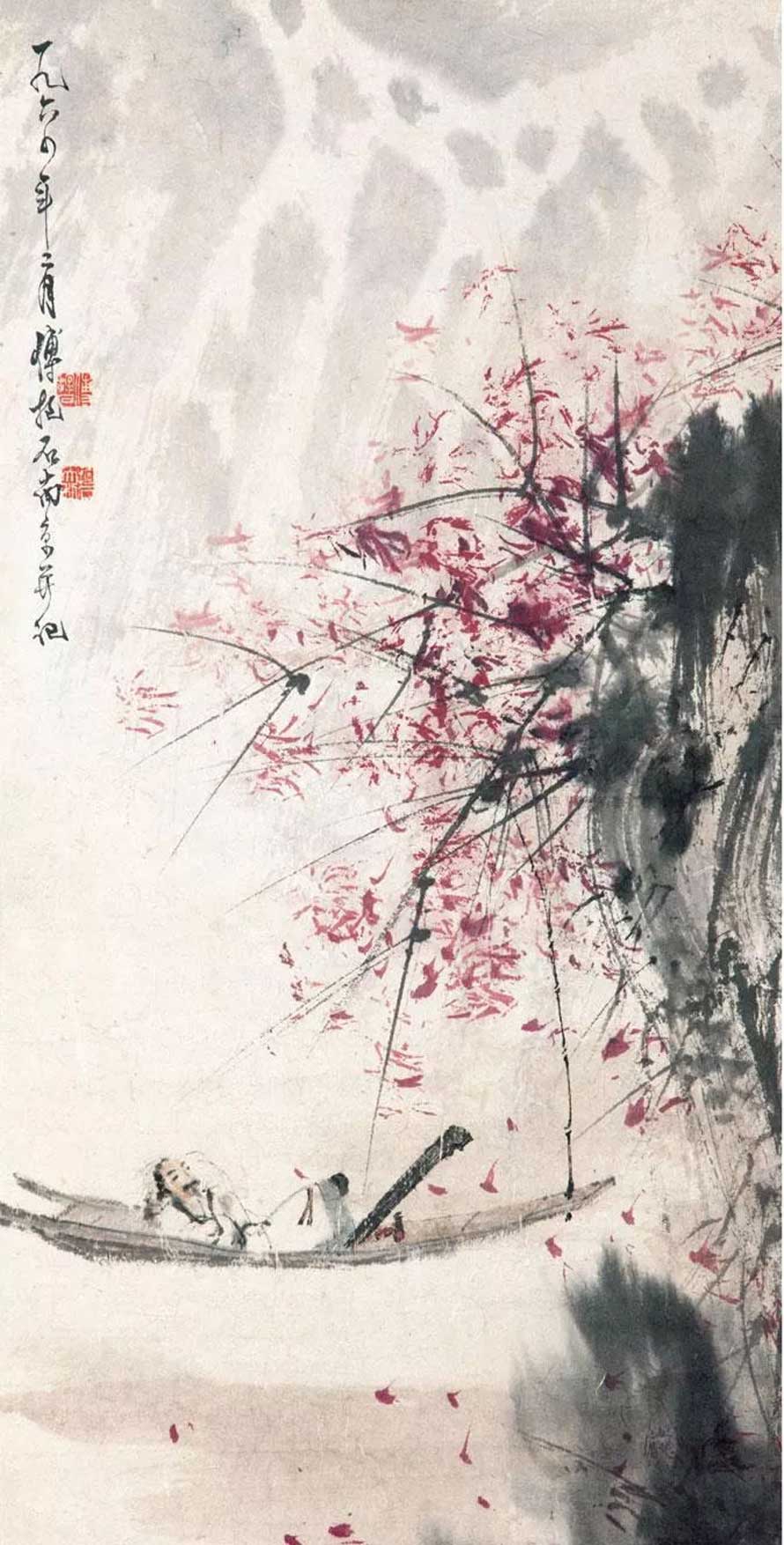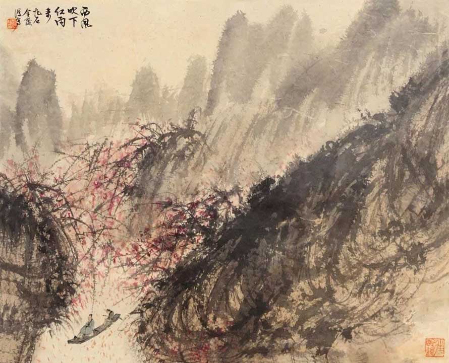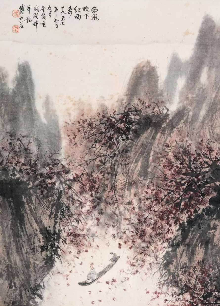 “秋风吹下红雨来”,是画僧石涛的题画诗句,傅抱石推崇石涛,曾多次对诗作画。抱石先生易一字作“西风”,似乎更含蓄而更有诗情。
