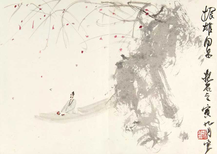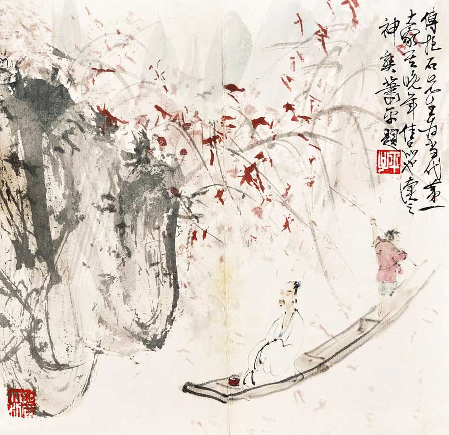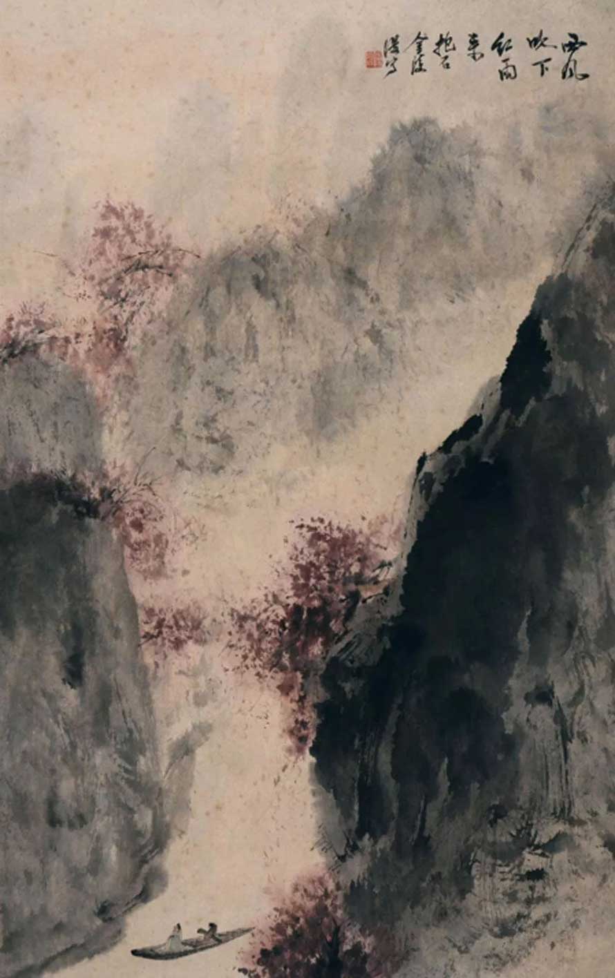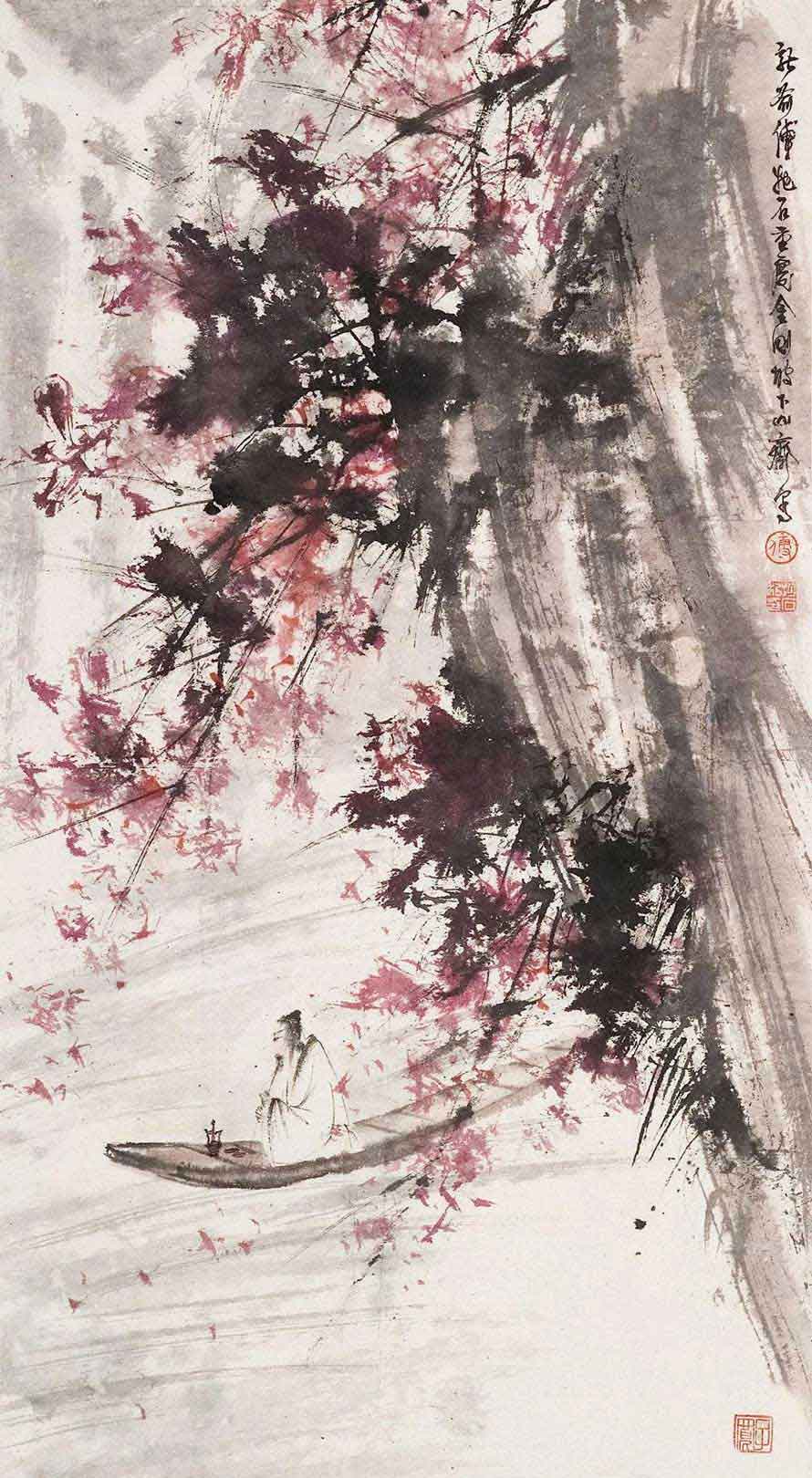 “秋风吹下红雨来”,是画僧石涛的题画诗句,傅抱石推崇石涛,曾多次对诗作画。抱石先生易一字作“西风”,似乎更含蓄而更有诗情。
