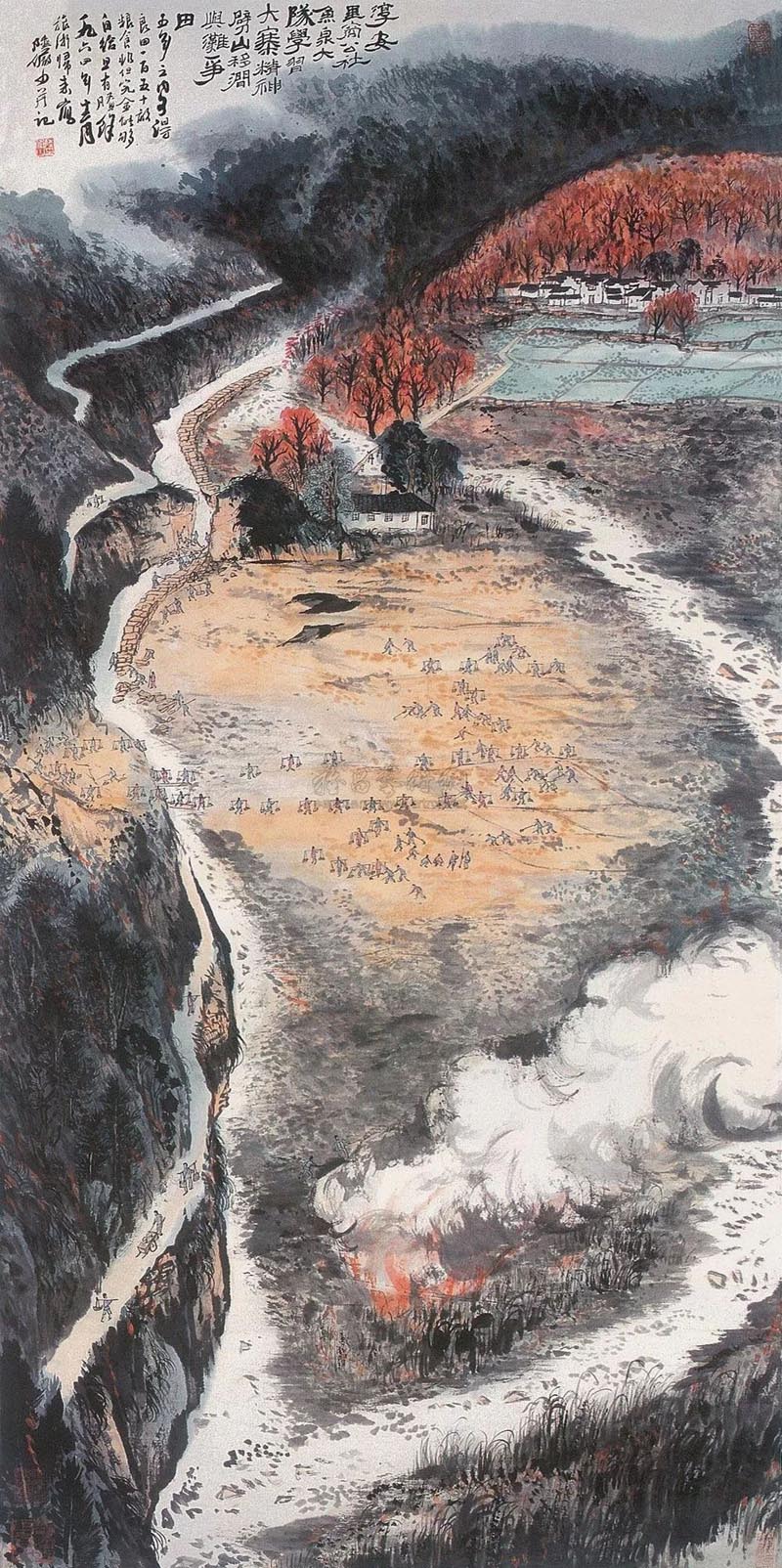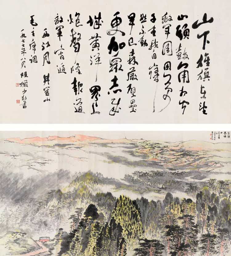 同时,两人作为20世纪后期杰出的中国山水画家,代表着当代山水画的最高水平,在海内外享有很高的声誉。其中陆俨少的创作善于将云水、江河、湖海的汹涌澎湃、浩渺弥漫之势描绘得淋漓尽致,特别是表现云和水的动感最为精彩,不仅笔墨淋漓顿拙,而且气韵生动、神彩飞动,并创造出独具风格的“陆氏云水”。众所周知,一般画家构图总是从大到小,陆俨少的构图恰恰相反,别具一格,他曾说:“我一反此法,而是由小到大,笔笔生发,初无定稿,积小面成大面。在创作过程中,每或思路断绝,形势扦格,山重水复,终已无路,而转折之间,柳暗花明,绝处逢生,又是一个新境界”。