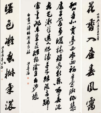 书法成就:一生亲历民国以来现代书法的发展,50岁以前书法广涉篆、隶、真、行、草各体,晚年尤精行草书,气酣势疾,刚健有力,韵味沉厚,雄浑遒劲,卓然成家,被誉为“书坛泰斗”。擘窠榜书被称为“真力弥满,吐气如虹”。海内榜书,沙翁第一。治学严谨,对书法学、古文字学、篆刻学、金石学、考古学都有精到研究。在书法上沙孟海受康有为、吴昌硕影响,代表了北碑雄强一路而开一代风气,无论篆隶楷草,在书法史上均占有重要地位,尤以行草书最佳。然而,沙孟海最为后世所知与认可的,当数他的榜书。