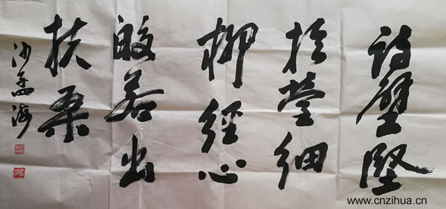 2、藏品之二。诗壁坚于莹细柳,经心皎若出扶桑,沙孟海。尺寸:50×100cm。