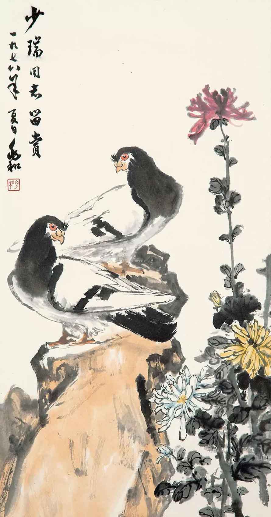 △1978年作 菊石双鸽图 60×32cm
