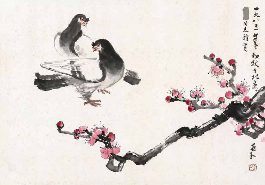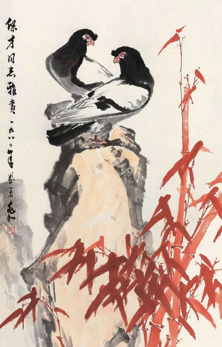 △1980年作 朱竹双鸽 69×45cm