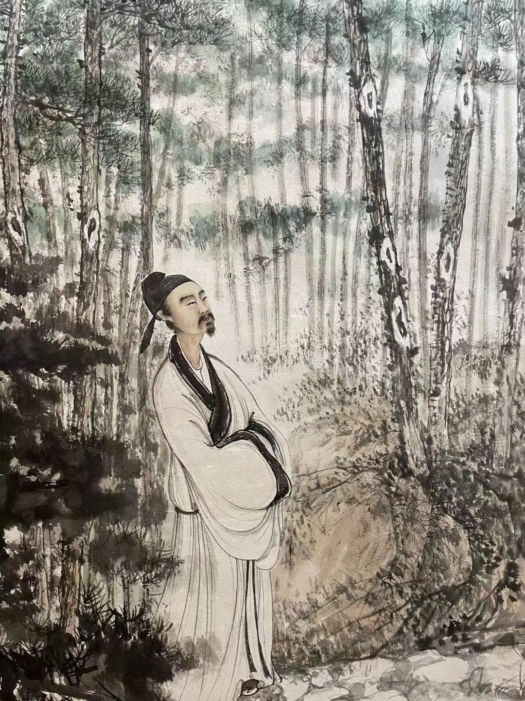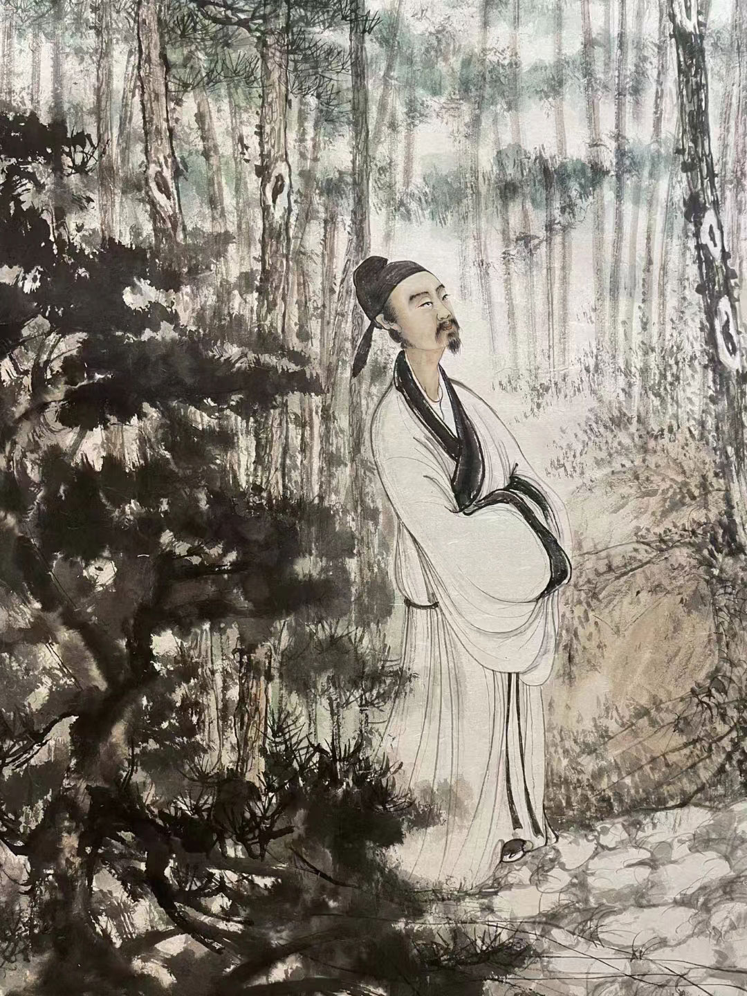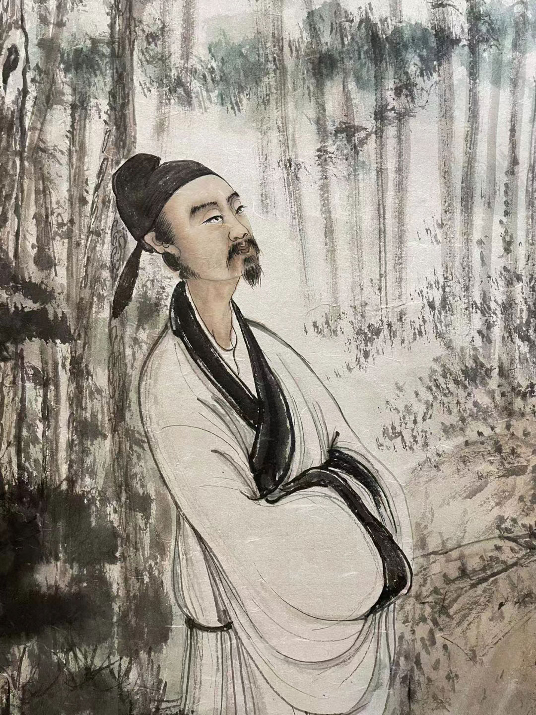 历代画作表现李白,多注重形象,放荡不羁、潇洒超脱,而此作将李白形象置身于万竿松林之中,实属画家创新之举。李白形象位于画面下方,文人雅士的形象在傅抱石肆意徜徉的笔墨下表现的淋漓尽致,诗人微微抬头,其服饰衣带以流畅细腻的线条表现出来。诗人面部以柔和的色彩着色,而发须则用浓墨湿笔皴染,其神态在浓淡墨色对比之间变得清晰。李白两手藏于袖中,姿态优雅,面容祥和,成熟豁达,但眉宇之间透露出轻逸脱俗之态,十分传神。