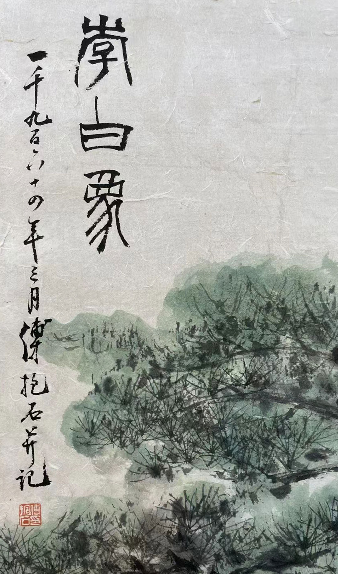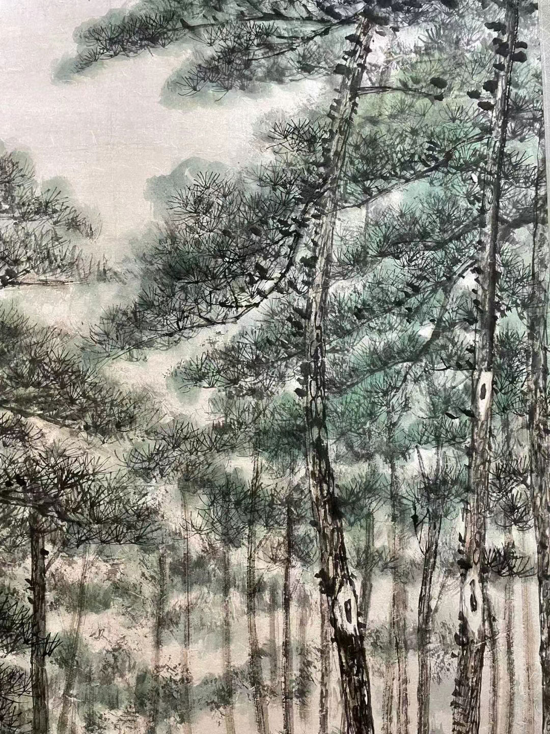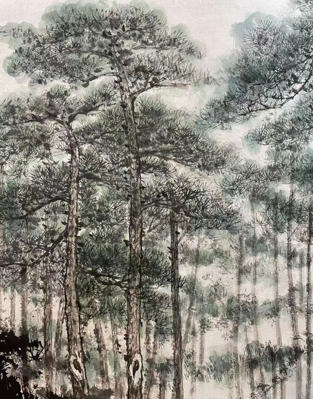 在中国文化语境中,松树因长青不老、高耸入云而被赋予特定的精神意义,象征品行高洁的高士,在历代绘画中均有所表现。诗人置身松林之中,松树幼小,枝干细嫩,但是却透出穿云之势,诗人喜爱新松是因它峻秀挺拔,不随时态而变。画家在营造出垂直动感的同时,并未失掉丰富的细节,松叶以石绿色打底,松针则以快速而刚劲的线条刷出。在半空中以空白表现云雾之气,凸显环境幽深,前景和背景的松树错落排列,亦呈现出相当景深。画家画毕题识时尤其有心,所用书体纤细爽利,与周围新松的幼细松针融为一体,毫不突兀。