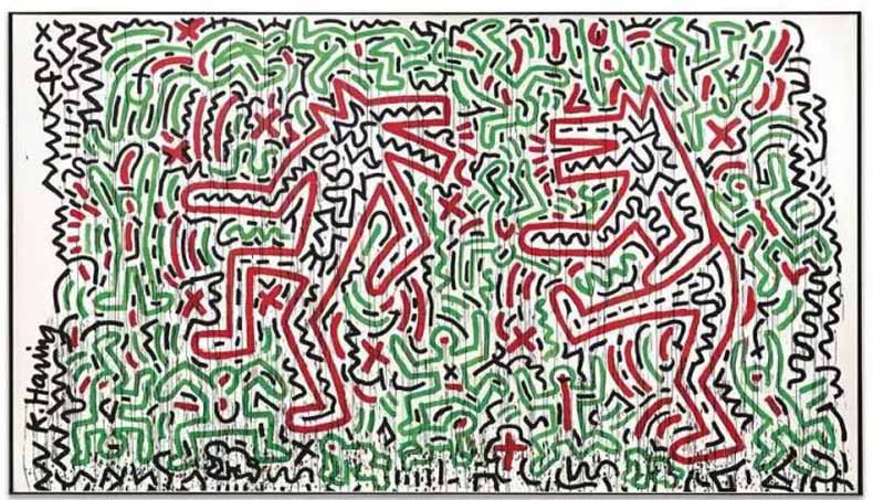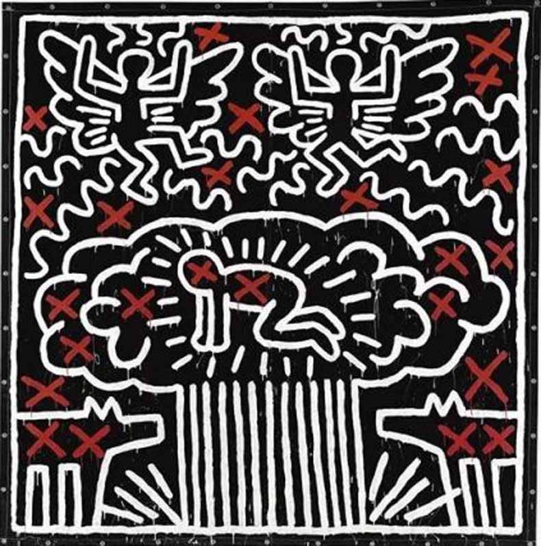 凯斯·哈林目前的拍卖纪录是他于1982年创作的《无题》,于2017年在苏富比纽约拍卖行拍出654万美元。这张画里,他把现实缩小到只剩下基本元素和颜色,以获得更直接的观看体验。其中有很多他的标志性符号,孩童,狂吠的狗,天使和红色X…这幅画事实上讨论的是关于人类使用核能的问题,从而表明他对文化“爆炸”的关注。就好像“婴儿”作为艺术品的中心,象征着青春和生命,在死亡包围它时,惊人地消失在爆炸的烟雾中。