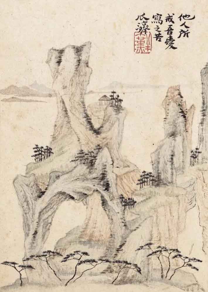 如上图《山水册八帧》,画中的山川、松树及构图方式都是被当时的主流所排斥的,但石涛却钟爱于此,并题跋:他人所戒,吾爱写之。