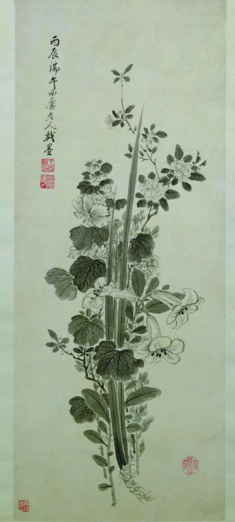 明末清初画家王时敏《端午图》(图3)描绘了菖蒲、蜀葵、玉簪以及蔷薇等几种初夏的时令花卉。该图所绘花卉笔墨简练洁净,清新古雅,表现了吉祥喜庆的意境。