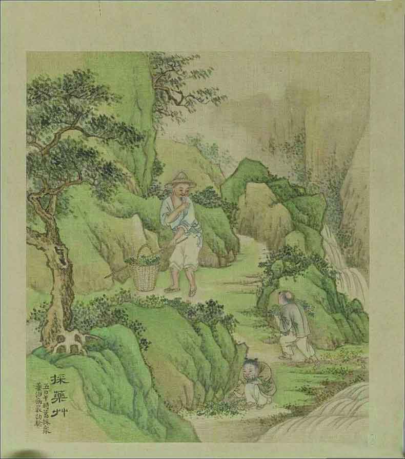 清代画家徐扬《采药草》(图4)是其端阳故事册之一,描绘的是一位老者带领两个童子在崇山峻岭中采药的故事。上题:“五日午时蓄采众药治病,最效验。”
