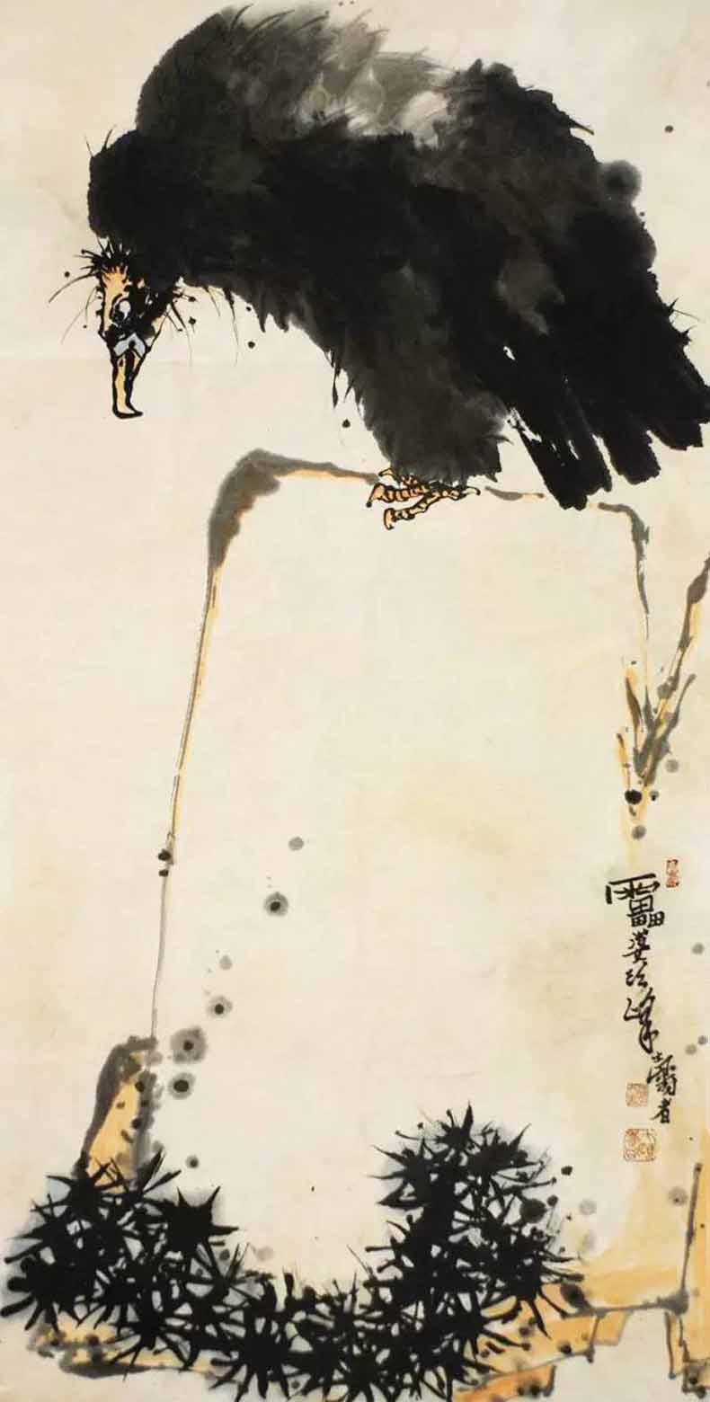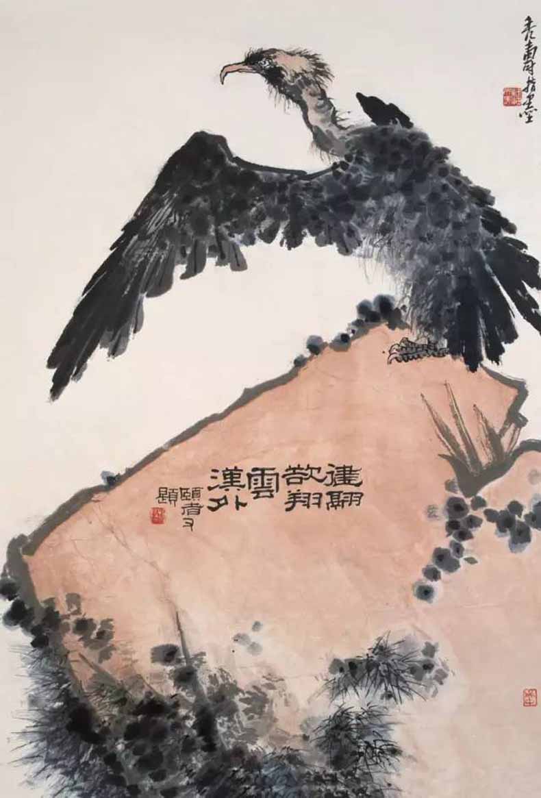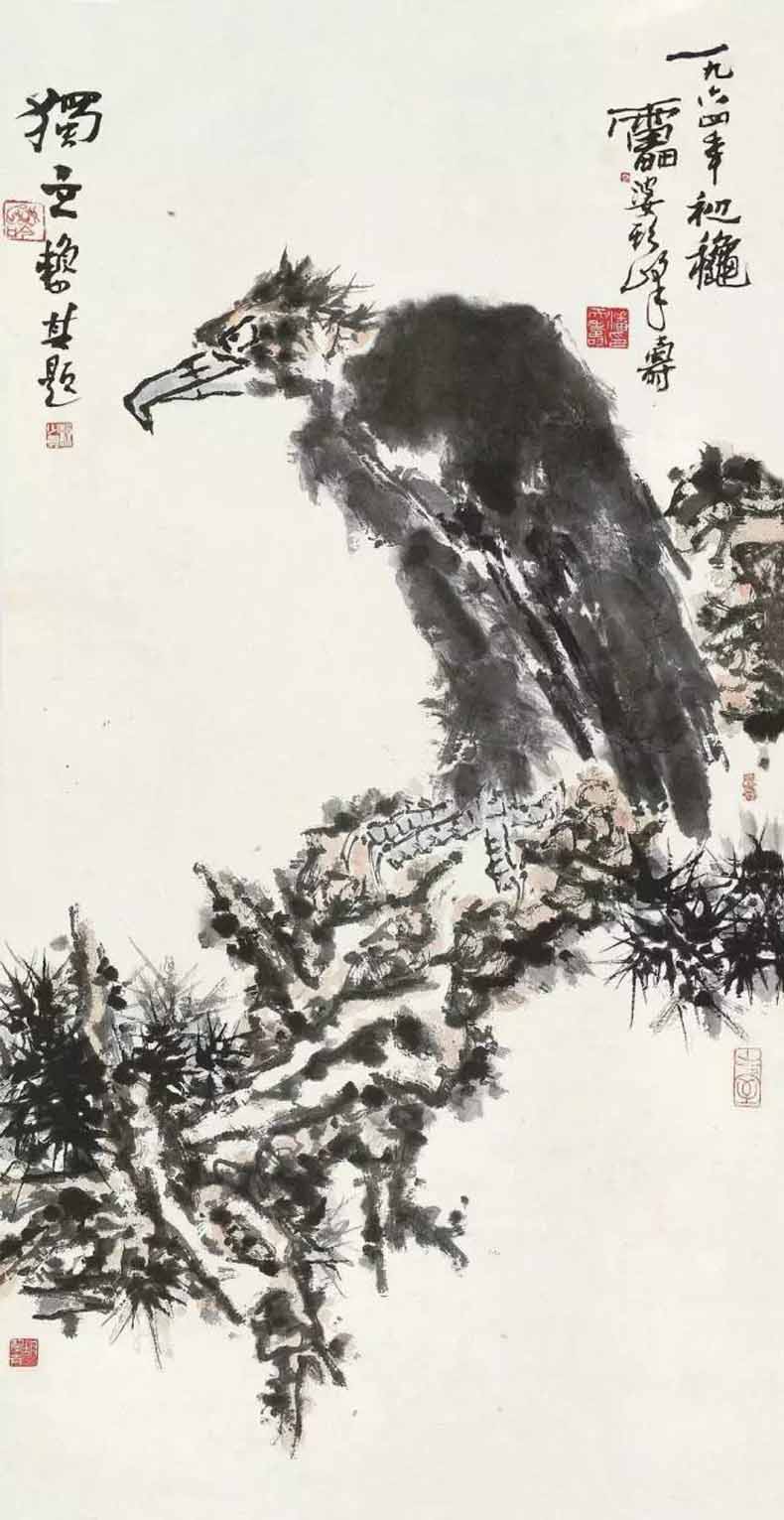 潘天寿还擅作指画,意在追求变化和指墨所特有的韵味,他笔下的许多鹰鹫图就是其指墨画的杰作。