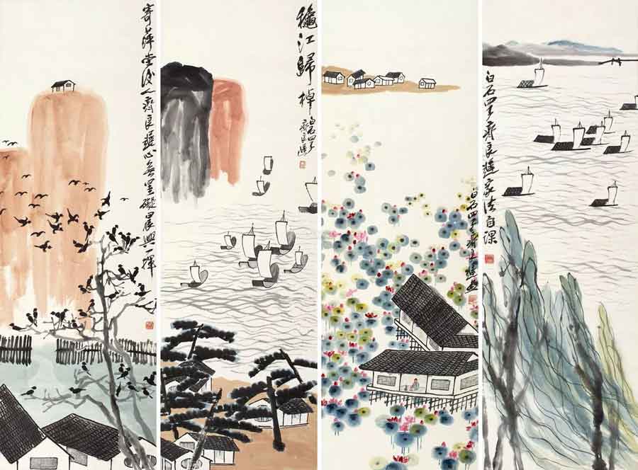 △齐良迟 山水 四屏 100×33cm×4