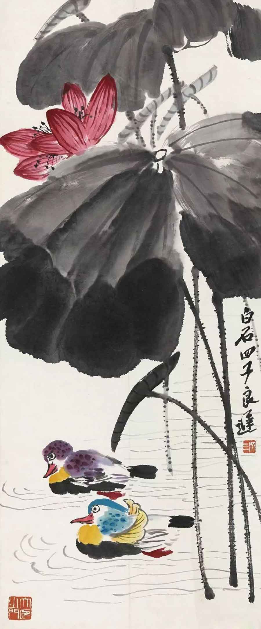 △齐良迟 荷花鸳鸯 115×48 cm