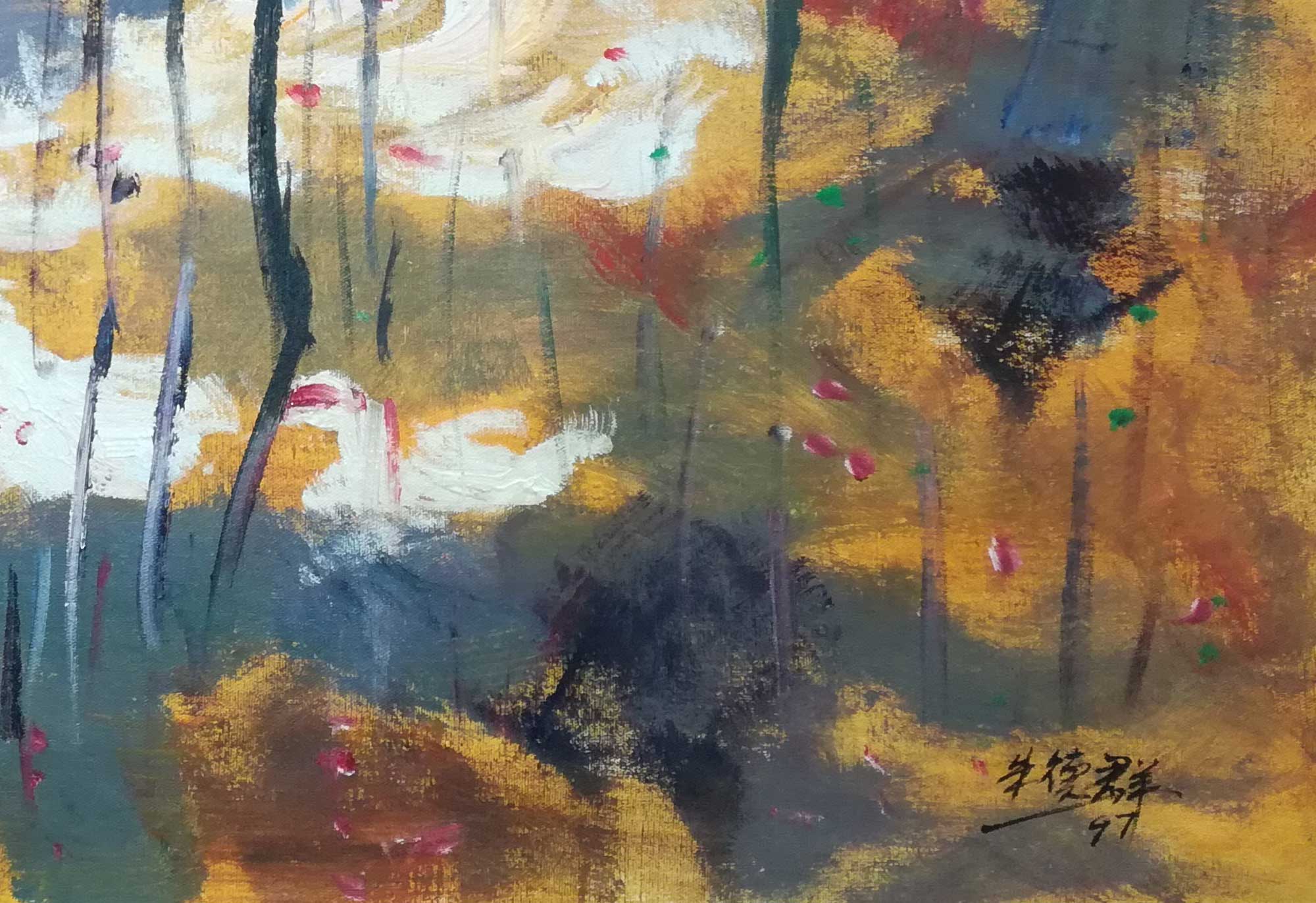 核心提示:朱德群,法兰西学院艺术院第一位华裔院士。在法国画坛享有“二十世纪唐宋画家”的称号。国立杭州艺术专科学校期间师从林风眠、吴大羽,打下坚实的油画基础。还有国画巨擘潘天寿授其传统绘画课业。与赵无极、吴冠中一起,被尊称为“留法三剑客”。他以中国水墨,书法的丰富内涵,创造了一个诗意的自然空间。下面为名人字画网藏品,朱德群抽象油画作品《荷塘群鹅》,作于1997年。尺寸:60×90cm。手机简单拍照,图片未经任何艺术处理。